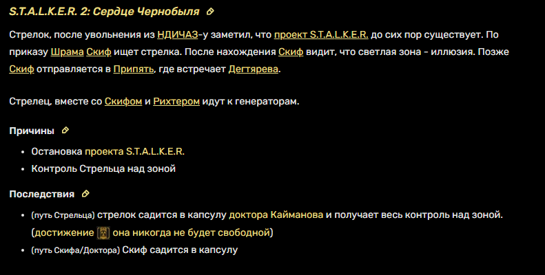 >>50100555 Где? Покажи. На ру вики в статьях по трилогии упорно игнорируется Сталкер 2. А в статьях по Сталкер 2 игнорируется трилогия. Буквально доходит что чуши, что в статьях, скажем, о Стрелке или Сидоровиче на вики по трилогии "Появляются в таких-то частях" без упоминания в С2, а на вики во С2 "появляется в С2", будто бы в трилогии не было ни Сидора ни Стрелка. Это полная чушь и бардак. Не знаю как на мове, но на английской вики что-то такого нет, может потому что у западных фанатов не припекает жопа со сталкера 2?
