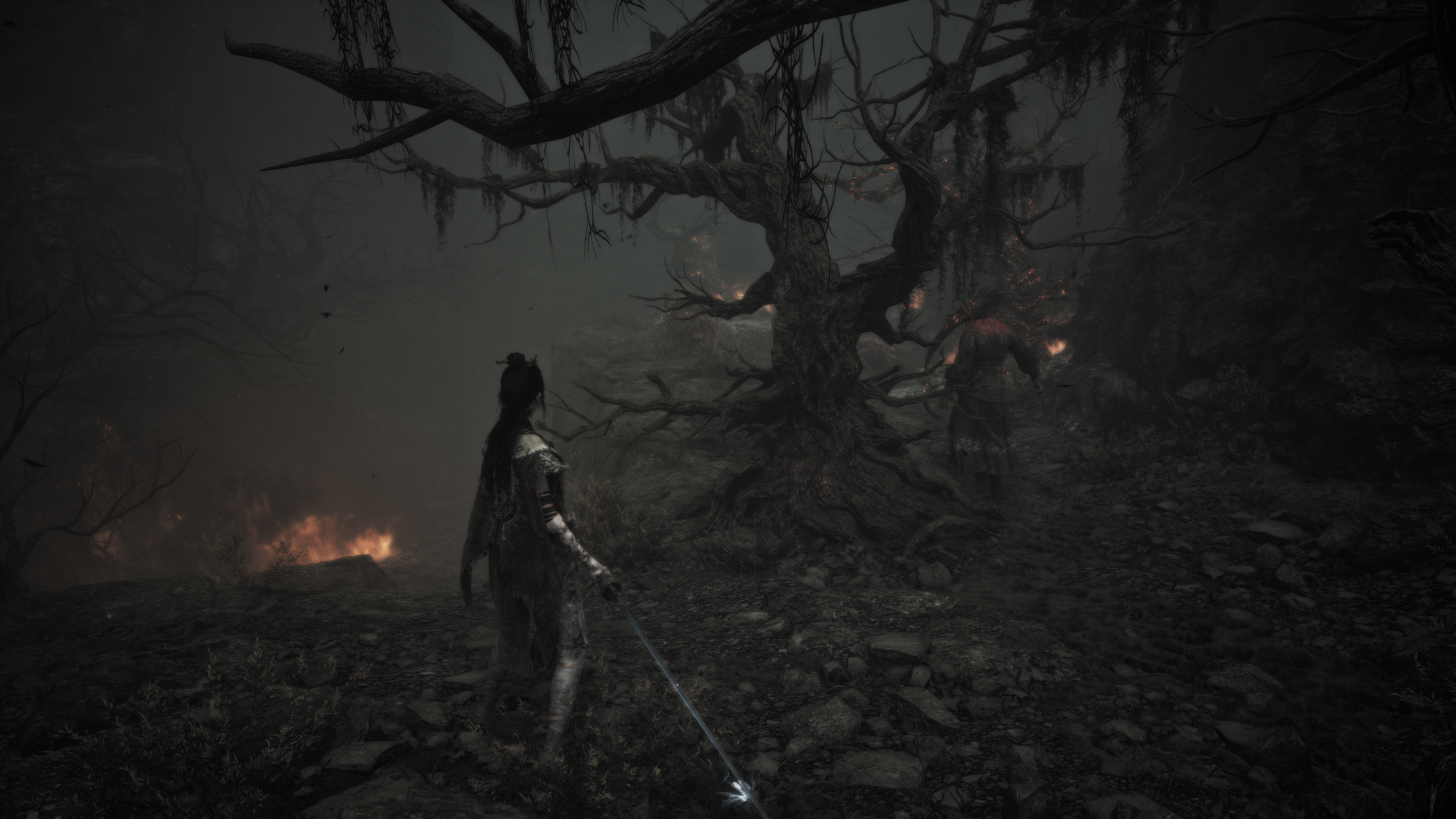 Теперь, в чём же редкость Вучан. Собственно, в воссоздании (с огрехами, конечно) той формулы, что характерна для первых игр душесерии - сложные конструкции уровней с множеством закрытых проходов + редкие костры + постоянные угрозы от environment. Просто как пример; в снежной локации хождение по снегу накладывает статус откусывающий половину стамины, а в пещерах, где снега нет, находятся кристаллы что заваншотят, если их не разбить. То есть, даже без мобов локация представляет угрозу. И ещё Вучан любит обманывать игрока, делая мобов вписанными в окружение, скрин как пруф дерево на переднем плане - моб. Сразу видно, что разрабы вдохновлялись бестиарием ДС1. Такой подход к дизайну игры мне зашёл, вот и назвал его редким. Никому это не навязываю, но что есть то есть.