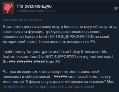 А кстати я ору у последней самой лучшей части батлы тоже отзывы просели, люди так же бомбят, где так же из-за недавнего обновления ввели обязательную поддержу секуре бут, и из-за этого у бомжей кто купил игру раньше игра работать перестала, луль.