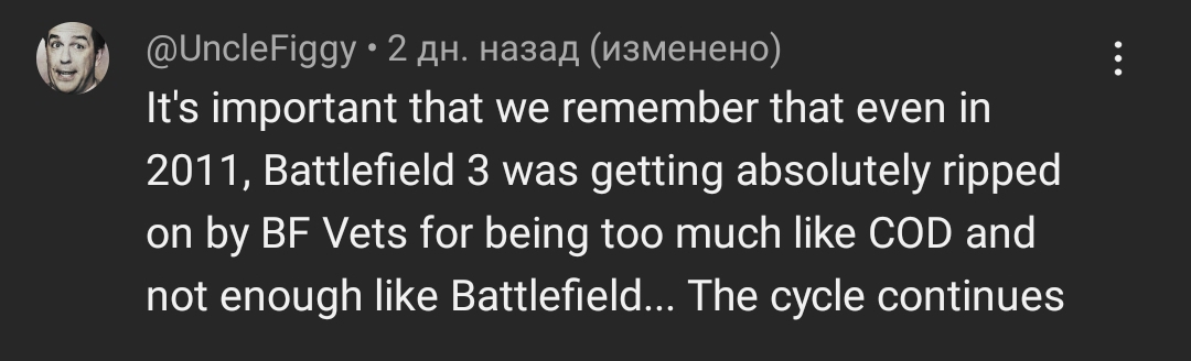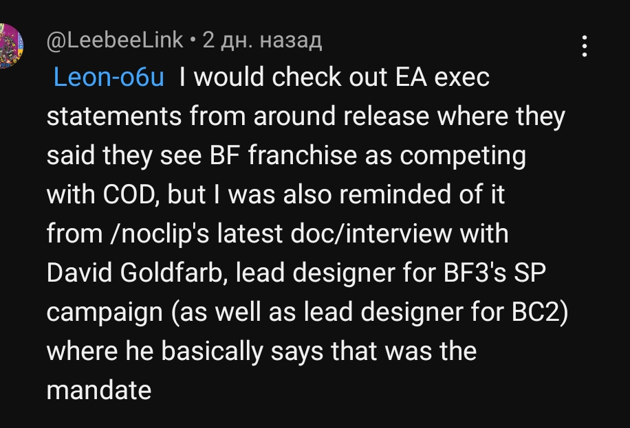 А мне кажется всё намного проще. Battlefield 6 - это про сдержки противовесы и компромиссы. Vince Zampella хочет поставить раком Activision за то что спиздили у него Call of Duty, ну и в самореализацию по пирамиде Маслоу на сдачу. ЕА хочет бабла, аудиторию и доить их по кд, Бумеры хотят как в Bad Company, Bad Company 2. Миллениалы хотят как в Battlefield 3, Battlefield 4. Зумеры хотят как в Battlefield 1, Battlefield V, Долбоебы хотят как в Battlefield 2042.