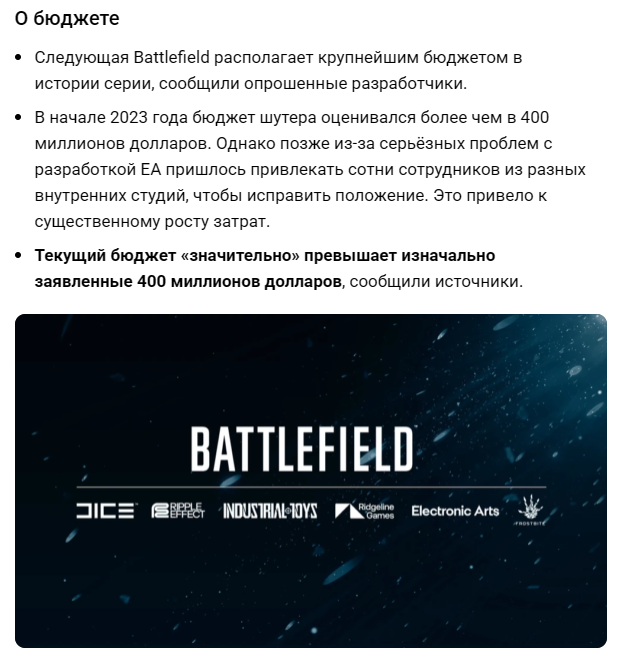 >>50106373 Что вообще в игре может стоить 400 лямов баксов, кроме маркетинга и может быть закупа серверного железа с сетевой инфраструктурой? Отмыв денег не называть