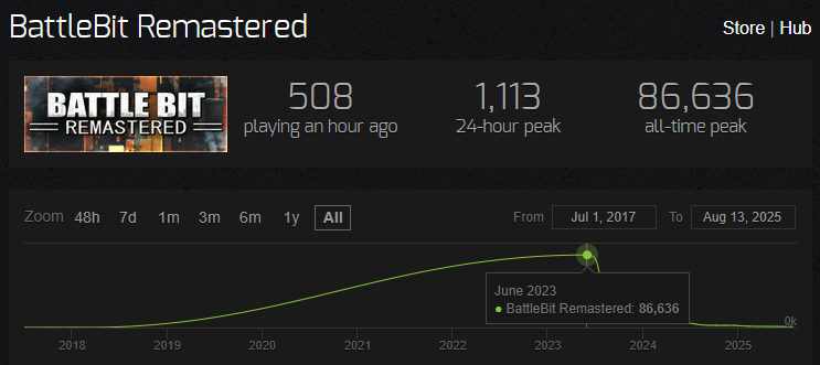>>50106234 Заслуженно провалившийся кал. В четверг ожидается анонс крупного дополнения с новой картой, на 4 дня онлайн вырастет, но дальше упадёт снова на парашу, где ему и место.