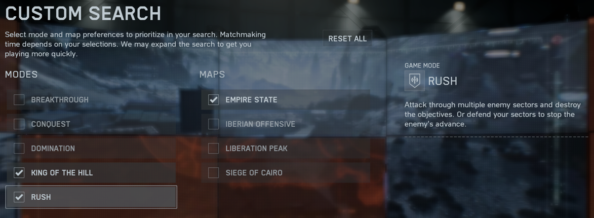 Спасибо Зампыня, поиграл! Убрал раш из подборки, остальные режимы перемешал, в итоге через кастом поиск его ищет по 5-6 минут, а это буквально один единственный играбельный режим. -1 день бетытерпишь ты, мразь)