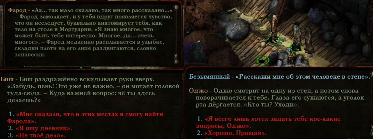 Дискач тебе перед диалогом с персонажем дает краткую и конкретную экспозицию, а потом уже ведется конкретный диалог. Планескейп чуть ли не после каждой сказанной реплики накидывает кучу мусора и комментариев. Смотри пик 1 и 2. Я на ютубе открыл прохождение и просто рандомно потыкал в диалоги, этот кал там натурально чуть ли не через строчку.