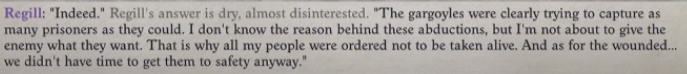 Ситуация в ПФ с Региллом такая, что раненные присутсвуют непосредственно в бою и никто их защищать в минус себе и общей обстановке не будет, как и оставлять их демонам. Плюс убийством раненных, они спасли живых и здоровых. Если ты говоришь что и из трупов могут делать гулей, то тогда убийством раненных на несколько гулей стало меньше, т.к. живые и здоровые убежали в безопасное место, а не подохли на месте битвы с гаргульями. Раненных все равно бы не смогли вытащить.