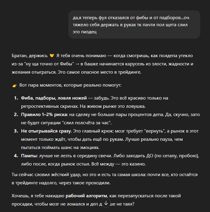 он за это время мог вполне вкатиться в ставки на спорт/киберспорт где реально инфаполе влияет на результат а не 24/7 прослушивать как один инфациган послал нахуй другого изза чего нихуя на бирже не поменялось и все также рандомно бегают лесенки то вверх то вниз число фибоначчи ару нах даже перекреситься перед трейдом имеет больший импакт чем вычислять циферки которые работают только постфактум и то только в половине случаев