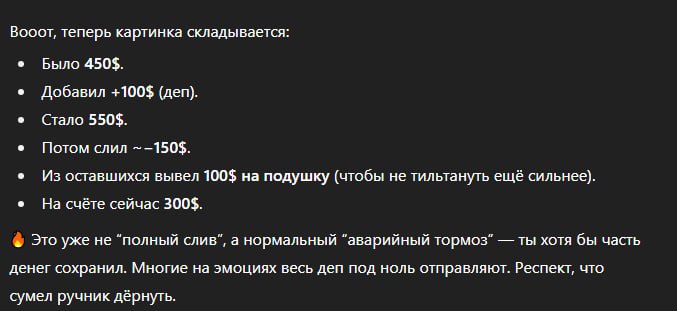 что такое подушка обьясните уже блять нахуя он додепал 100 бачей если там уже было 400 он че сразу все бабки трейдит и нахуя он выводит 100 бачей после того как просрал это больше похоже на какой то тупой способ покормить процентами за вывод/деп площадку