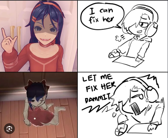 Вы блять понимаете что по сути ее игра это пыточная камера, где все, что она может это убивать других Мит со скуки и "ловить" настоящих игроков и играть с ними, потому что больше не с кем... Все книги перечитаны, все комнаты изучены, все уровни пройдены и все... И дальше хуй знает сколько еще это терпеть.
