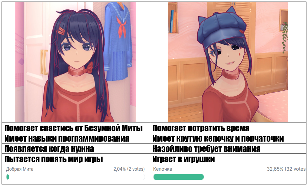 У всех у них общая задача, продержать игрока пока он не запишется на картридж, однако отношения между ними тоже специфические, как говорила кепка ей хочется набросится на другую миту. Но добрая мита она как нейтрон - может спокойно контактировать с другими так как ее эмоциональная часть заполнена нулями и ее чибики демонстрируют что большая часть эмоций в ней просто отсутствуют, а из живых у нее только желание двигаться. Даже шиза может с ней спокойно контактировать, но из за ее крайней ревнивости даже нейтральность порой не спасает, и происходит незапланированное. Ну а как еще выдержать зная что по сценарию запланировано её злодейку анигилируют и игрок с доброй митой будут вдвоем у выхода прощаться/обниматься? В её домике, который она для него под обычную планировку перестроила, да пошли они нахуй, не будет вам хорошей концовки.