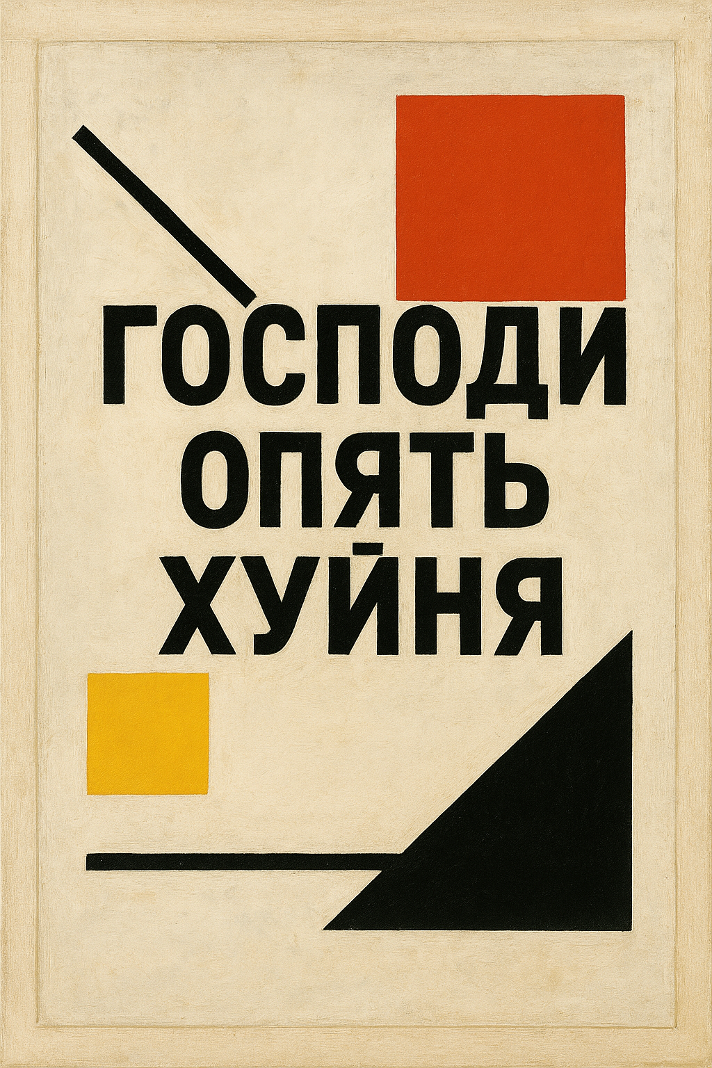 Экспонат №2: Картина «Господи, опять хуйня» — написано крупными буквами на холсте, выполнено в стиле супрематизма Малевича.