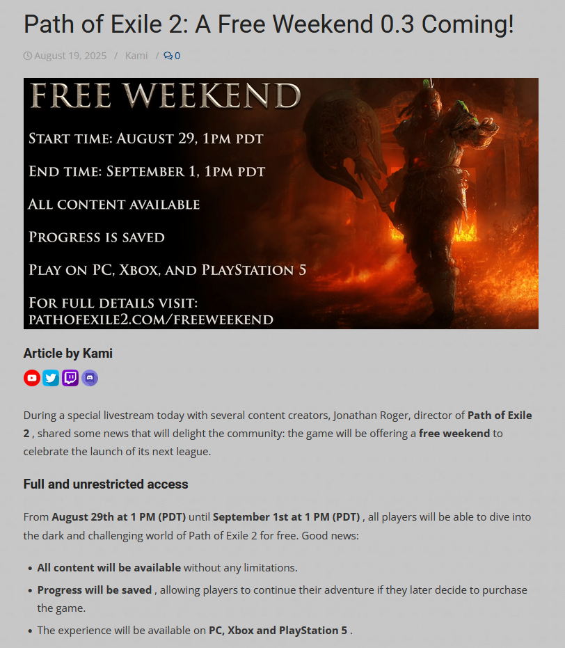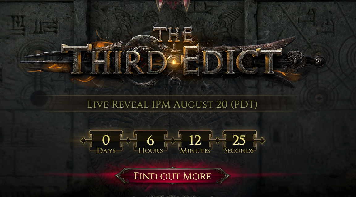 Events: Free weekend (Aug 29–Sep 1) with full access. “Dawn of the Hunt” league ends Aug 27; new update “The Third Edict” launches Aug 29, with a reveal live stream slated for Aug 21.
