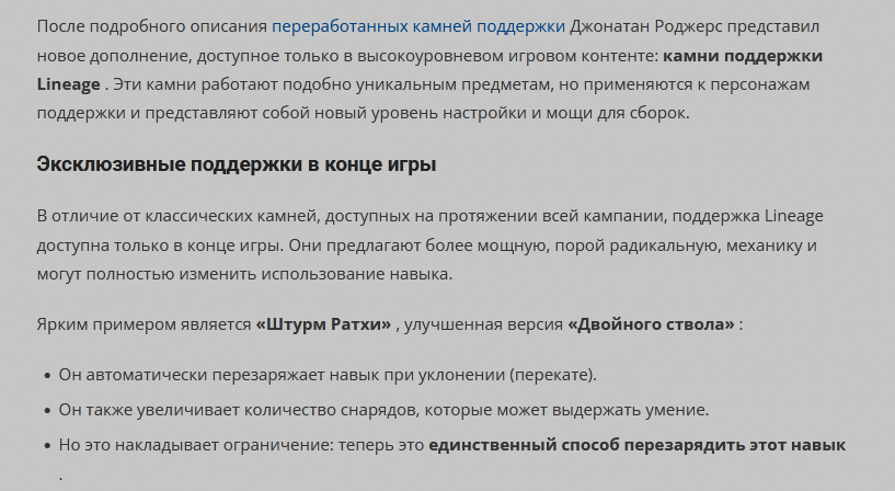 До сих пор каждый персонаж мог использовать только один экземпляр камня поддержки. Это правило было призвано предотвратить стандартизацию билдов вокруг одних и тех же мощных камней поддержки, но имело обратный эффект: оно препятствовало использованию нескольких навыков. Игрокам приходилось сосредотачивать весь свой потенциал на одной основной способности.