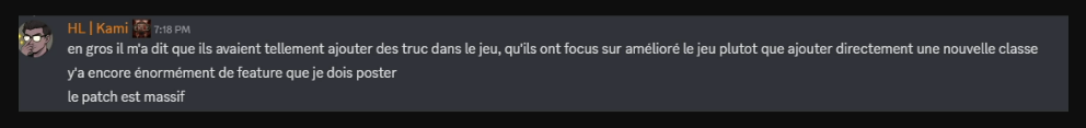 >"Basically, he told me that they had added so many things to the game that they focused on improving the game rather than directly adding a new class. There are still a huge number of features that I need to post. The patch is massive."