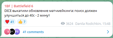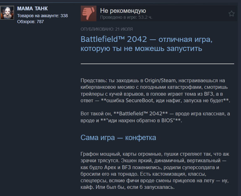 Здравсвтуйте ребята! Хочу вам сказать что мне очень нравится игра Battlefield 6, и я всем советую её купить. Мне очень интересно в неё играть, сразу видно возвращение серии к истокам. В игре классная стрельба и чувство настоящего поля боя. Приобрести предзаказ можно в Steam или EAPLAY. Рекомендую купить Phantom Edition, так как с ним вы получите максимально приятные эмоции. [/end]