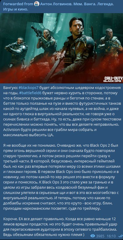Самая большая проблема грядущего бф в том, что большая часть предполагаемой ца уже давно не играет в игры. Челы смотрят тиктоки, крутят аниме шлюх, срут тупостью, собирая юшки на форумах, но сами игры как способ добычи дофаминчика уже не так серьёзно рассматривается.