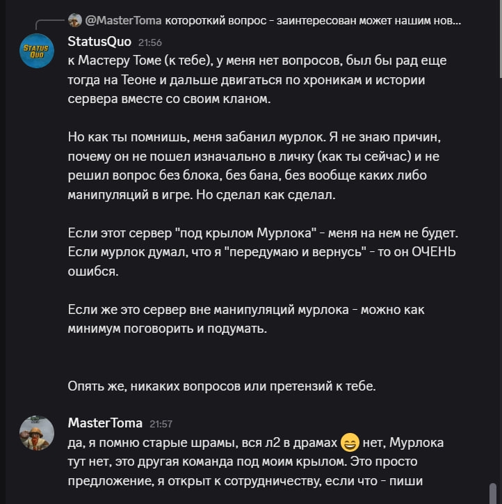 >>50095067 Чел, я клан сделал для всех. И не назвал его как-то издевательски типа ALTXRUX25. Просто назвал так же как и на реборне, где нас что-то да объединяло и мы были в большинстве. Я не скрываю что я хуевый папочка для всех вас, поэтому в прошлых тредах писал, что на изи передам управление кланом какому-нибудь идейному анону. Если ты думаешь что я просто вниманиеблядствую, то ты заблуждаешься, приятель