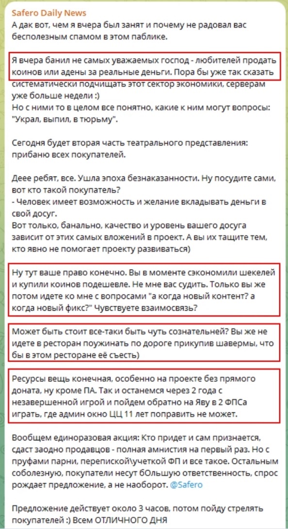 >>50098172 Смысл вкладываться в такие параши? Я понимаю, что один сервак вливают в другой и открывают новый. А если просто вайпают, то это говно полное, никто, кроме самых отбитых, в такое играть не будет.