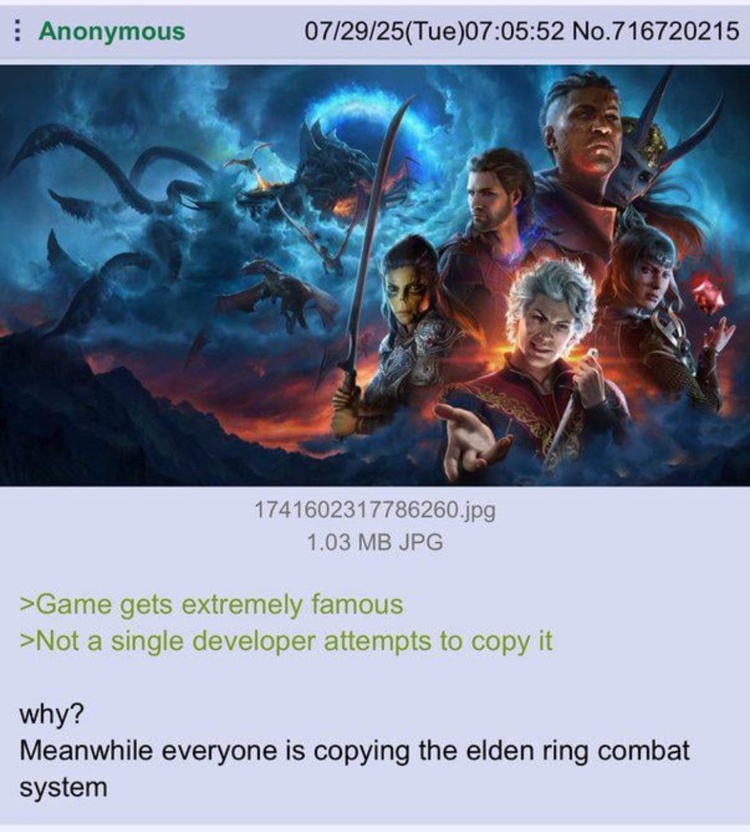 >>50161798 Нет, РТ получше. Я не получаю особого удовольствия от геймплея с активной паузой, а сеттинг уж очень вторичен (даже по сравнению с вахасолянкой). Просто немного странно говорить о каком-то невывозе Вахи, если в РТ нет ничего сложного, а сам сеттинг ГВ уже годами ведёт к тому, чтобы его даже 12-летки вывозили.