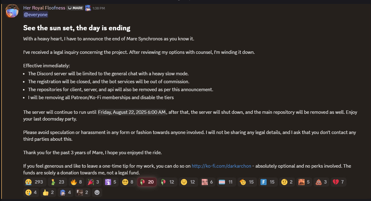 Effective immediately: The Discord server will be limited to the general chat with a heavy slow mode., The registration will be closed, and the bot services will be out of commission., The repositories for client, server, and api will also be removed as per this announcement., I will be removing all Patreon/Ko-Fi memberships and disable the tiers,