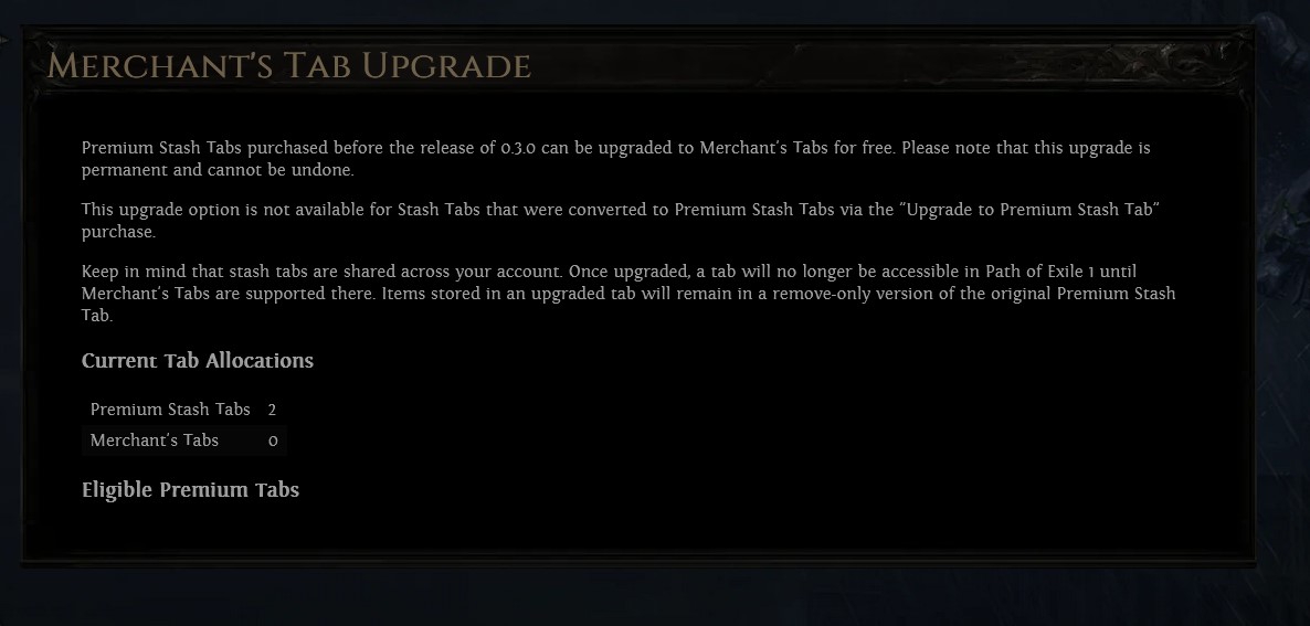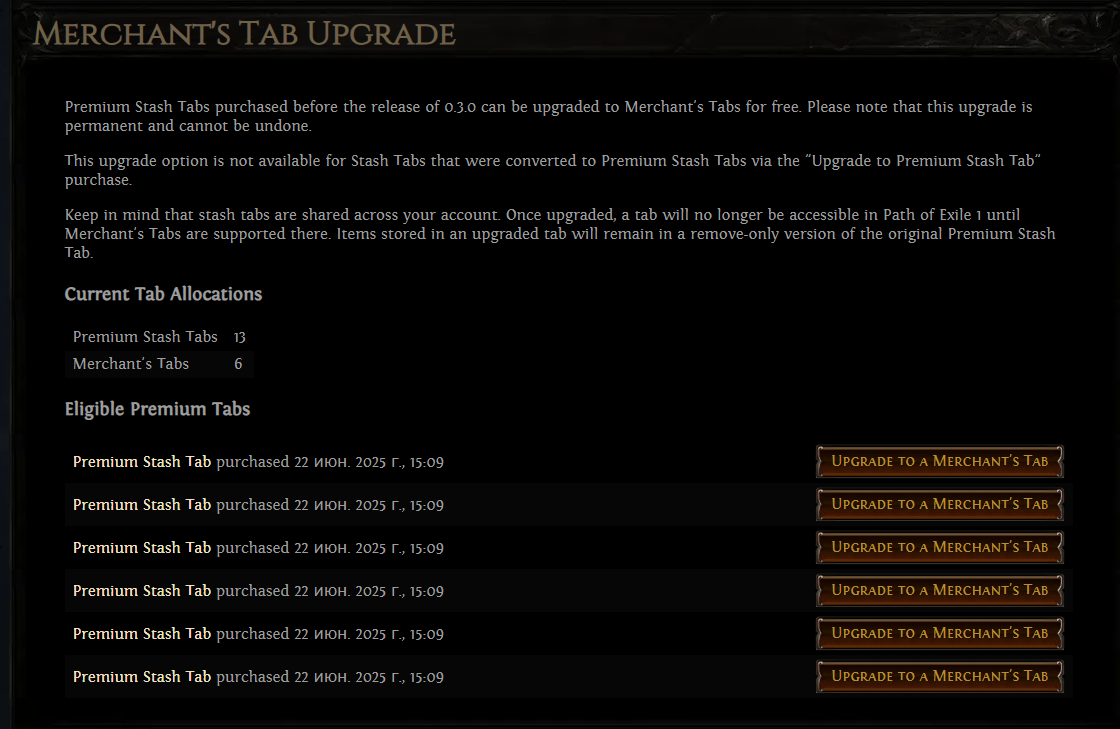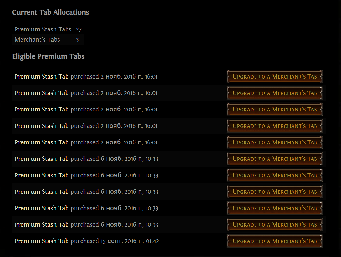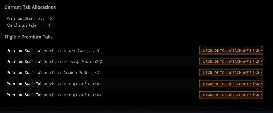 > August 29th is not a deadline to convert your stash tabs by. Куда спешить. Можно вообще чисто попробовать парочку сделать, а потом добавлять по мере надобности, главное, чтобы куплены были до 0.3