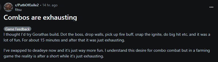 Чтоб отвлечь себя от томительного ожидания патча, решил скачать что-то похожее. Выбор пал на last epoch. После трех дней упорного дрочилова мобов в ласте, зашел в долгожданную PoE2боту, побегал час, плюнул и вернулся в ласт. Ластуха в разы интересней и нет ощущения грубой, неограниченной игры.