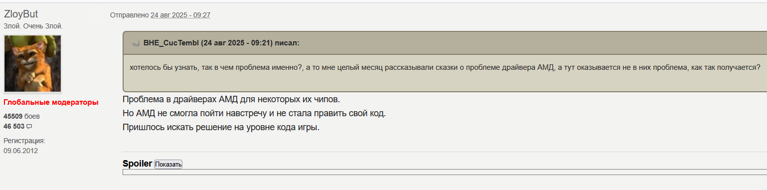 >>50173804 Они сначала на амд пеняли что типа дрова у них кривые, модер даже написал что они обратились в амд про это, их послали и они решают проблему "на уровне кода игры".