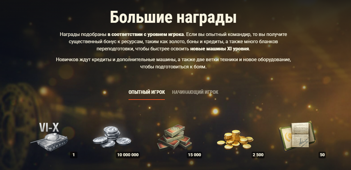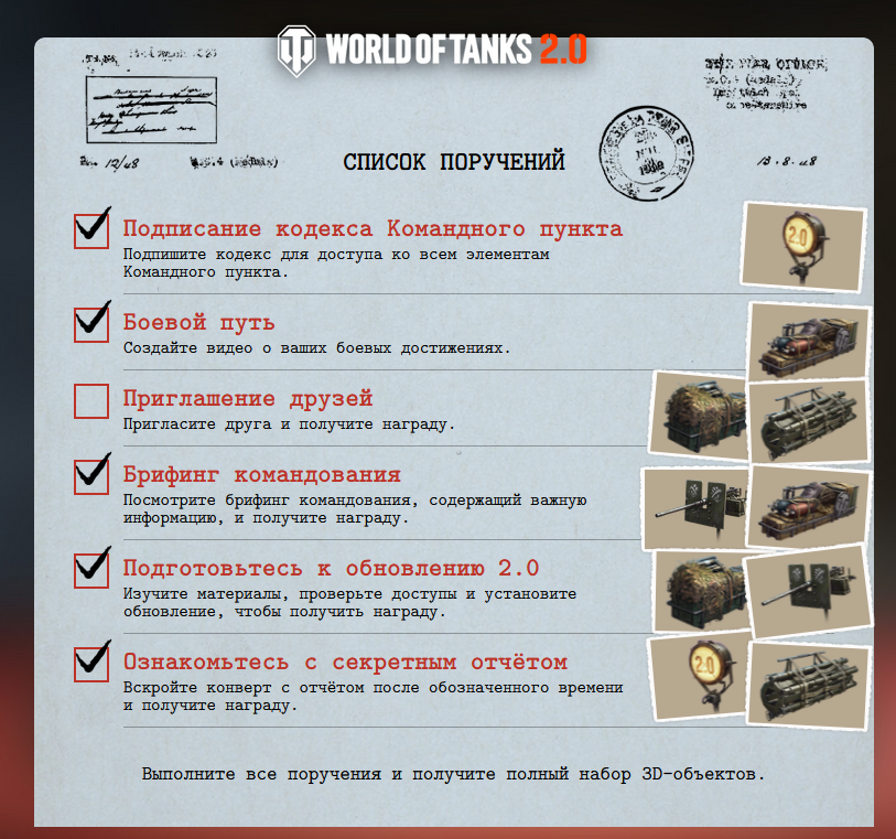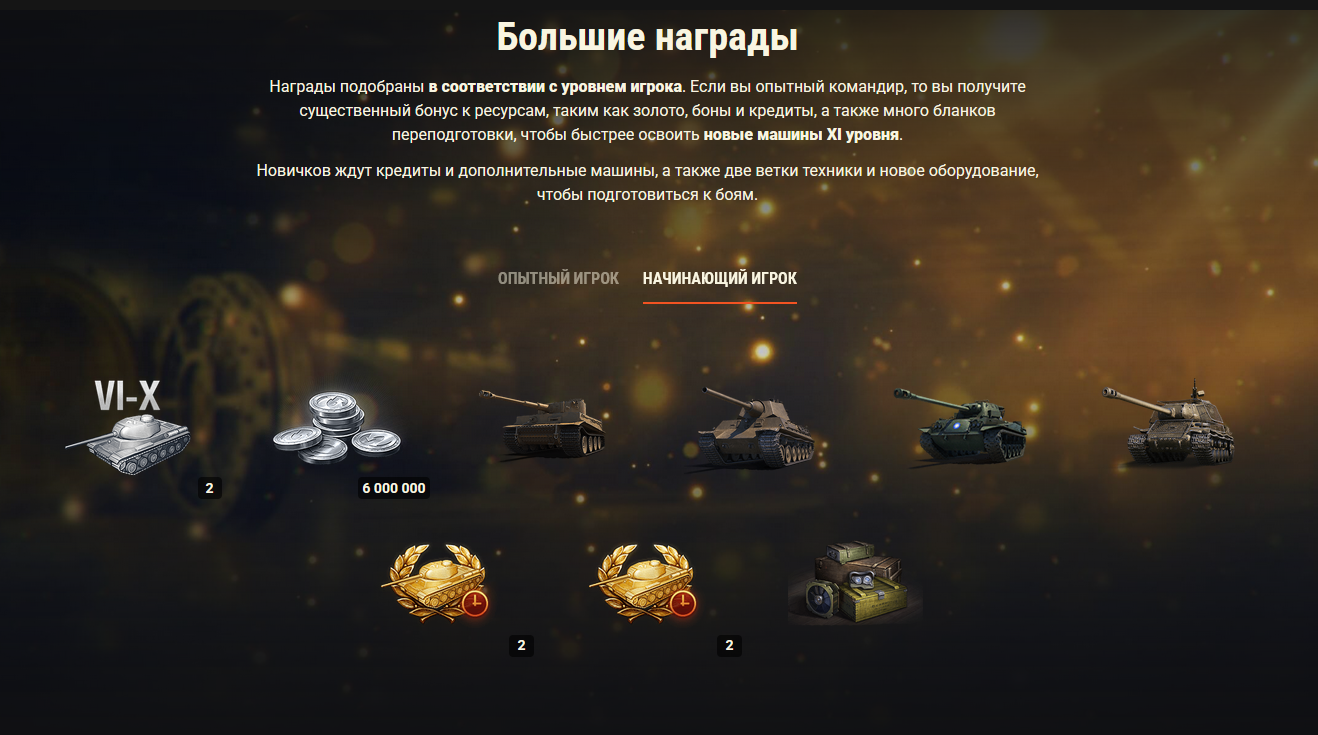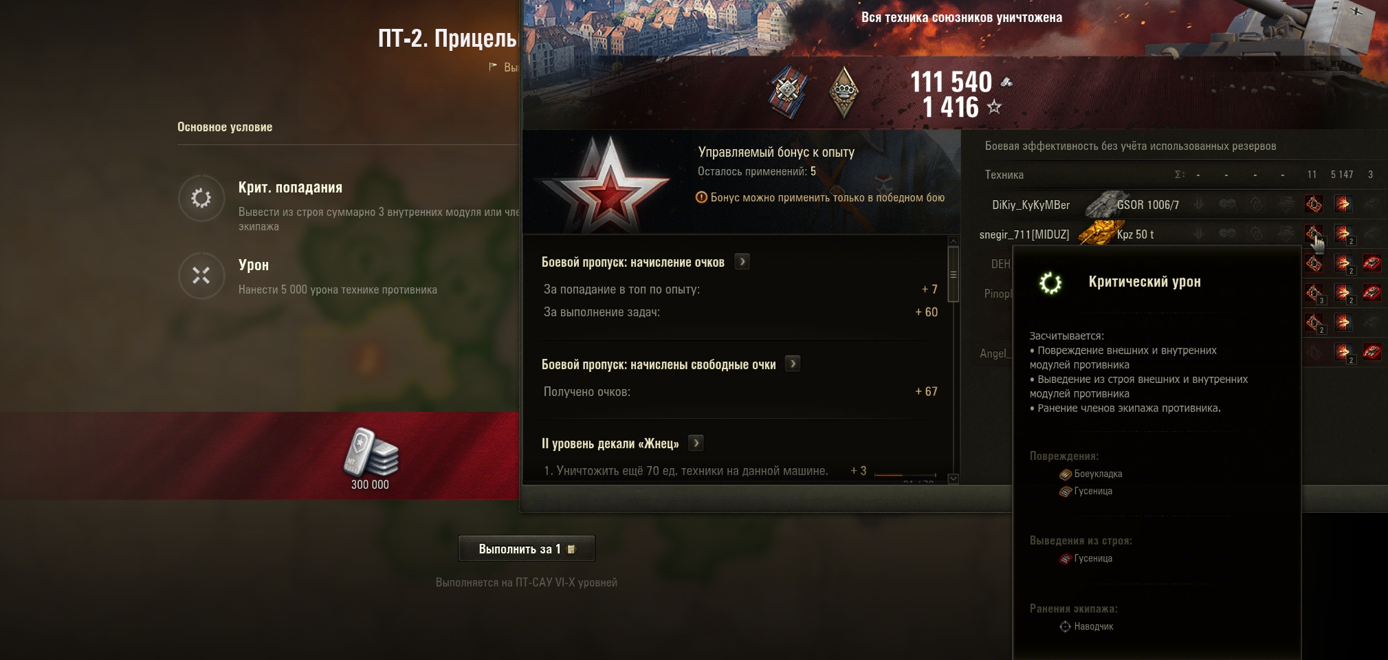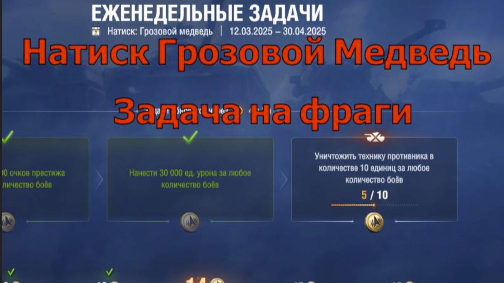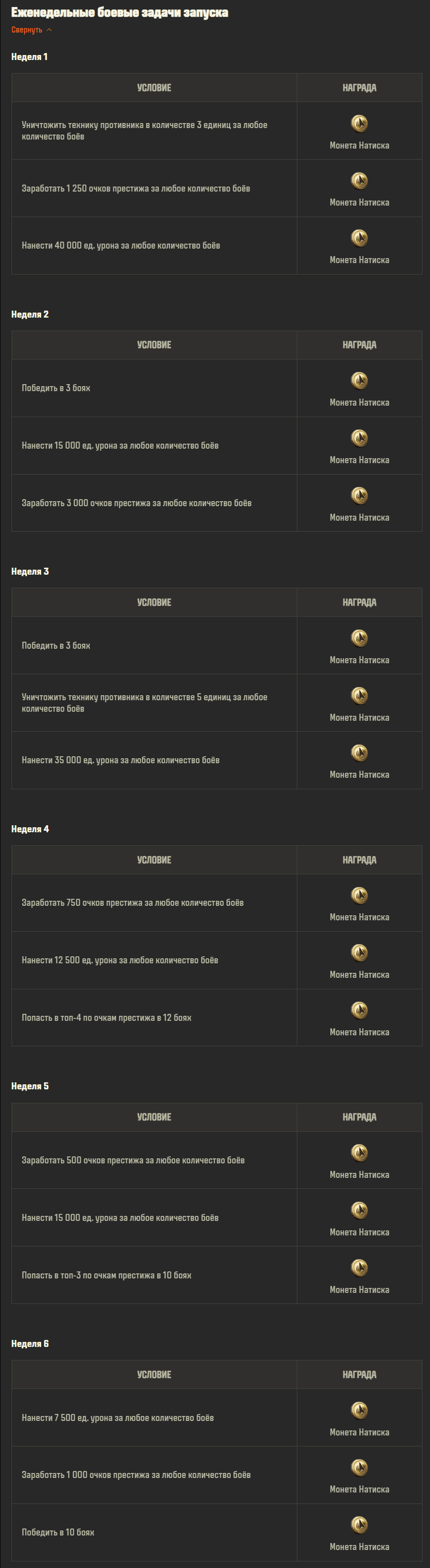 Заработать 2 000 очков престижа за любое количество боёв Нанести 30 000 ед. урона за любое количество боёв Уничтожить технику противника в количестве 10 единиц за любое количество боёв Неделя 5