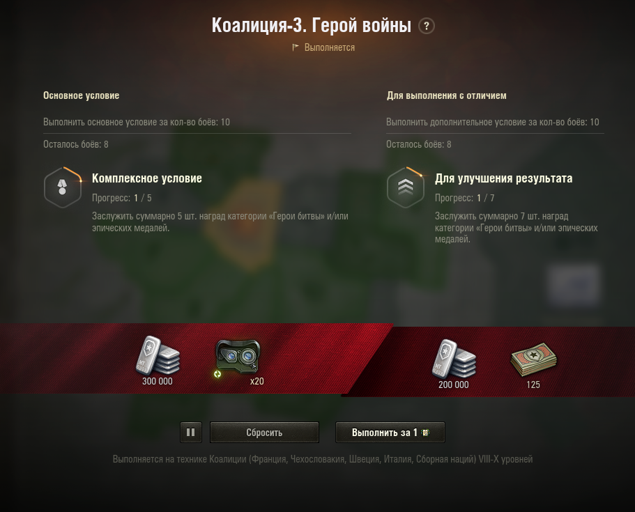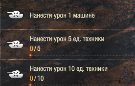 Победить в 3 боях Нанести 15 000 ед. урона за любое количество боёв Заработать 3 000 очков престижа за любое количество боёв