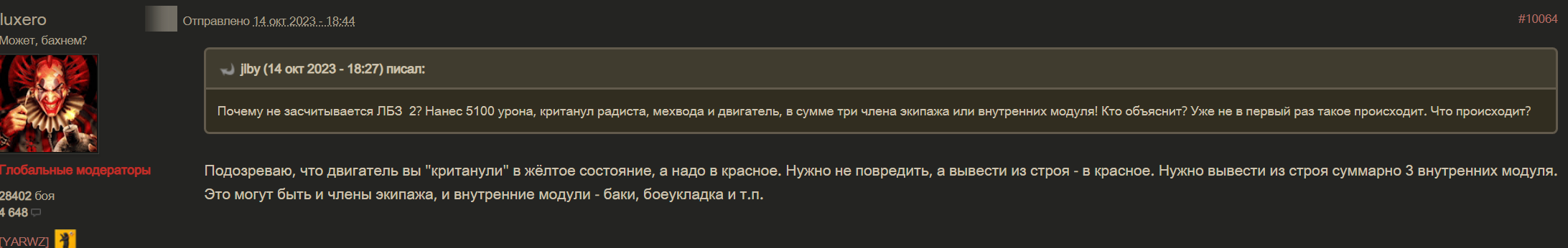 >>50179666 > с любовью прокачиваю модули и экипаж, делаю ЛБЗ ради челленджа, пробую интересные игровые механики и не жужжу. Тут пережирнил, про модули и экипаж лучше было пропустить.
