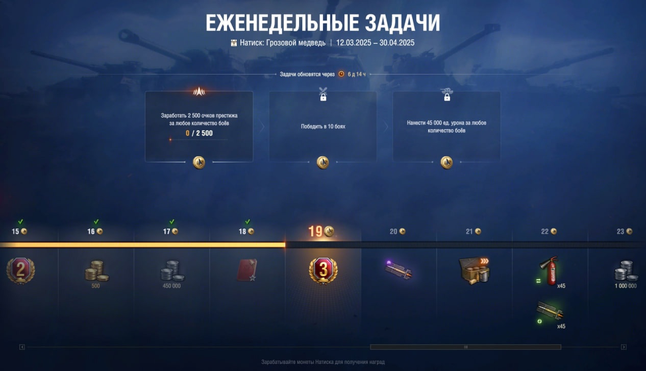 Заработать 2 500 очков престижа за любое количество боёв Победить в 10 боях Нанести 45 000 ед. урона за любое количество боёв Неделя 7