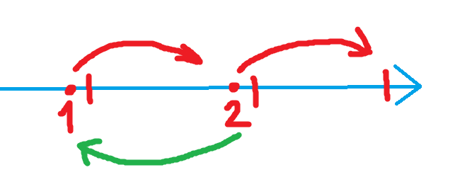 У нас есть две временные точки, 1 и 2. Эти точки отображают момент перед тиком закона отображенным красной черточкой на временной линий (голубая стрелка). Чтобы повлиять на второй тик тебе надо сейвскамить к точке 1 находящейся перед первым тиком, а чтобы повлиять на третий тик нужно сейвскамить в точку 2 перед вторым тиком. Сейвскам изображен зеленой стрелкой и демонстрирует стратегию сейвсками второго тика закона.