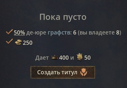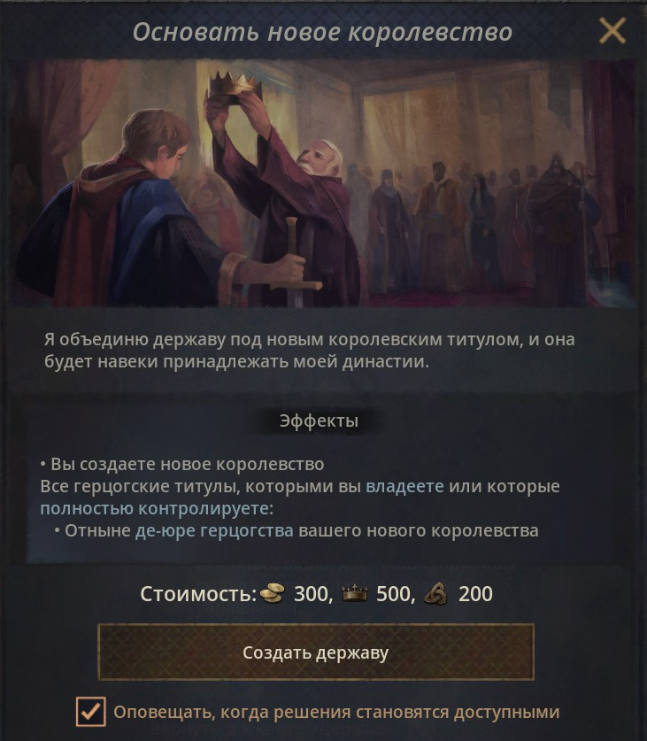 >>50156470 Чел, второе решение это формирование нового королевства, которого еще нет в игре. Оно получает де-юре все титулы герцогств, которые есть у тебя. Эта кнопка нужна чтобы формировать новые королевства в ситуациях, когда ты не имеешь возможности дозахватить земель чтобы узурпировать или создать титул уже существующих де-юре королевств, но при этом ты независимый и достаточно могущественный, чтобы объявить себя королём и это были вынуждены признать.
