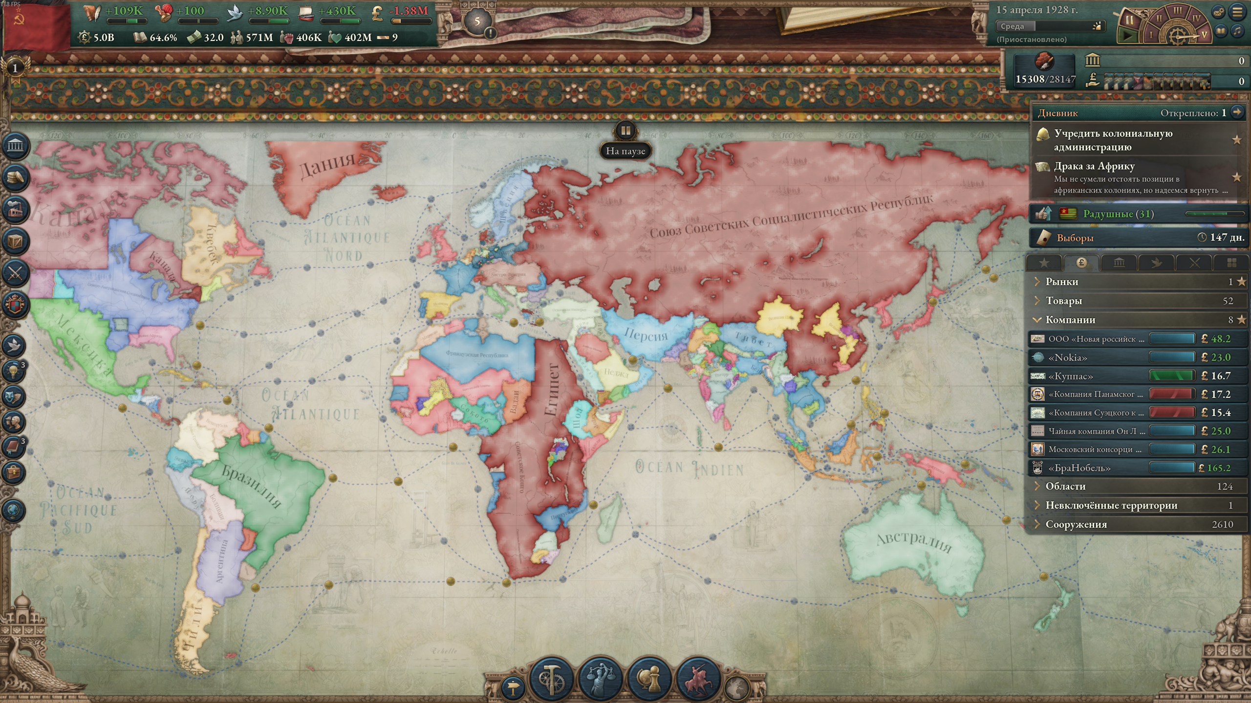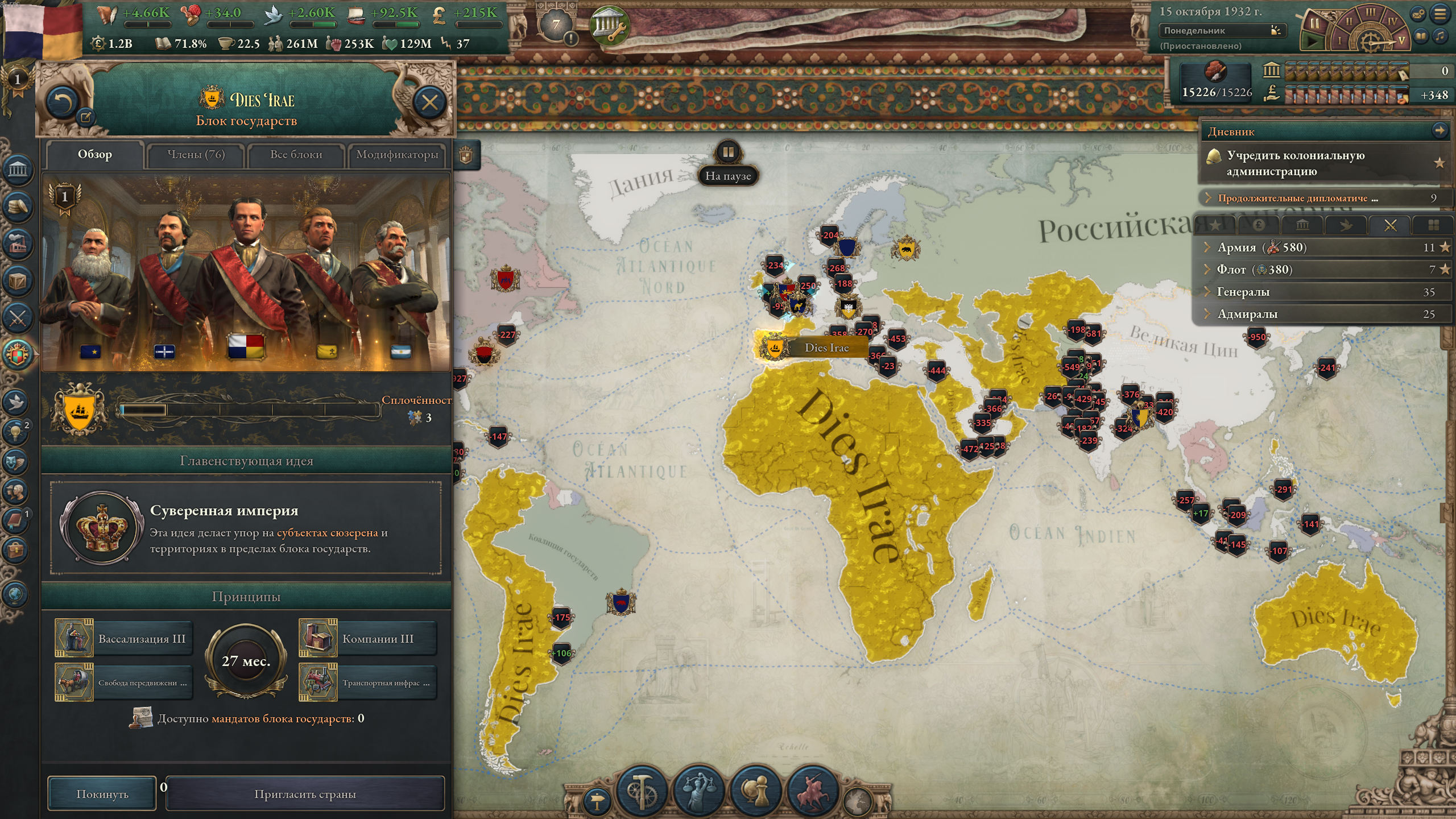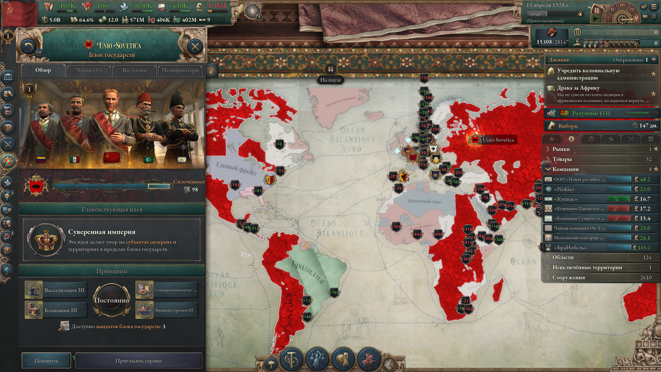 Фух, бля. Закрыл свой маленький гештальт: завоевал Африку. Из 76 членов блока только один независимый — Австралия (только потому, что она стала крупной державой, прежде чем я смог ее подчинить).