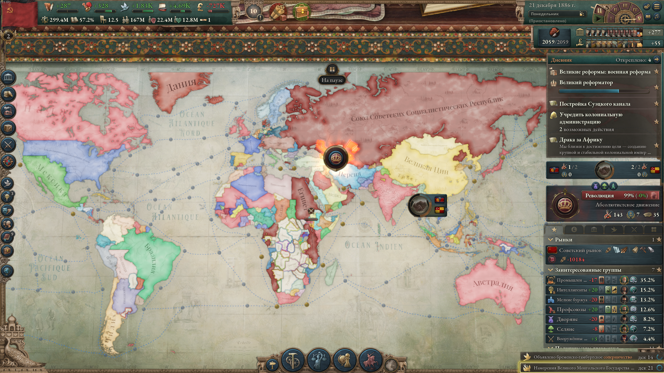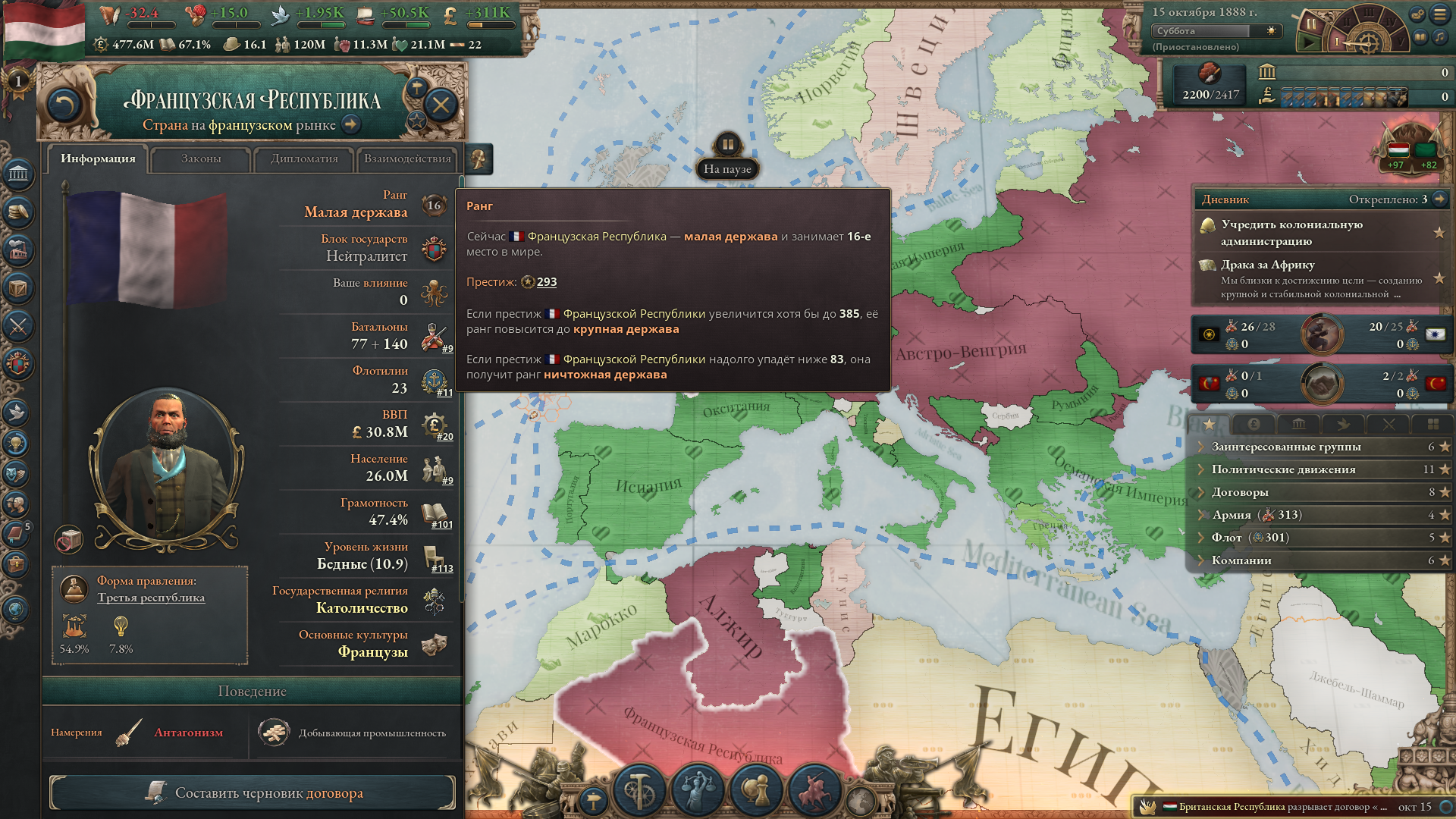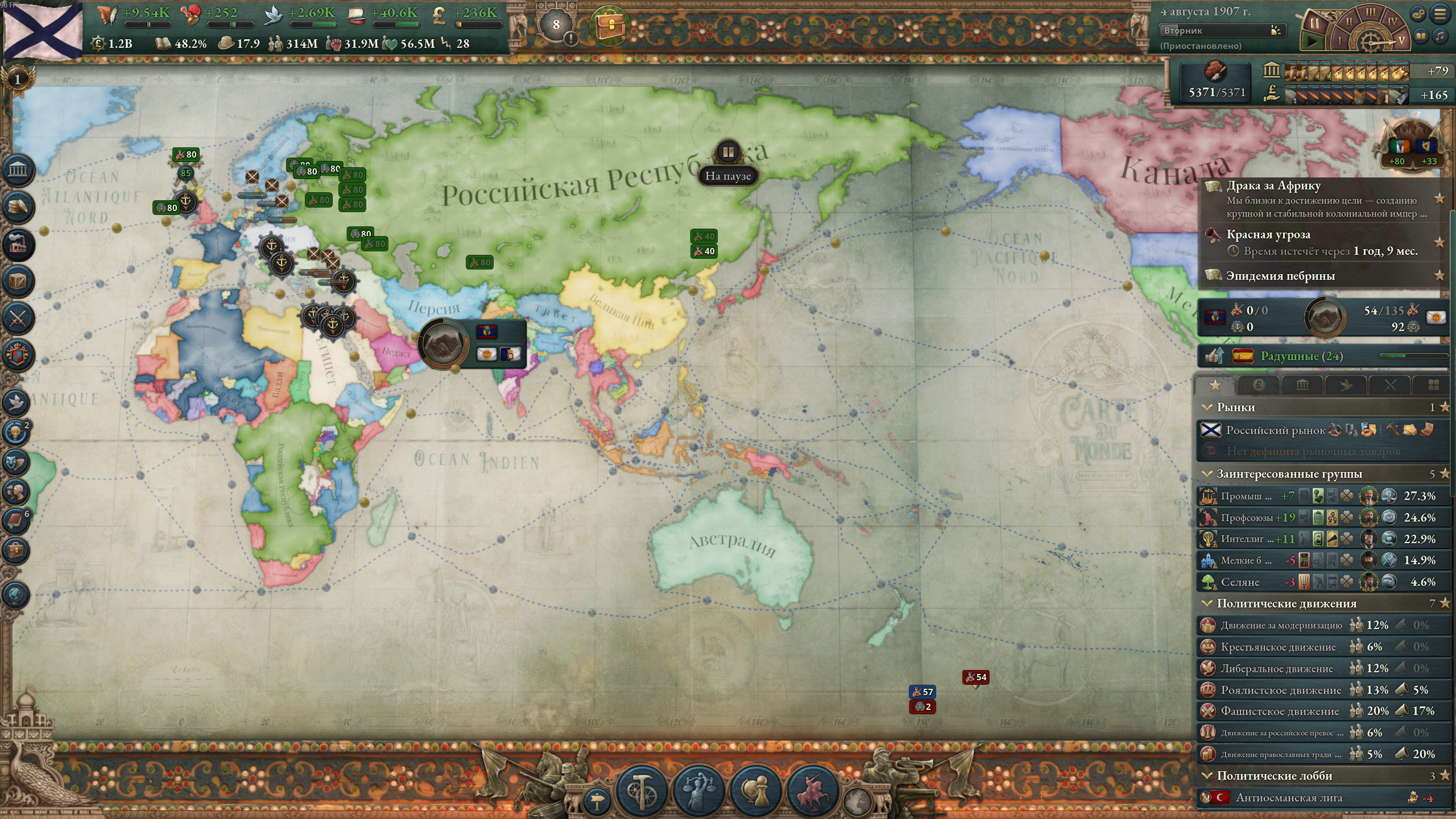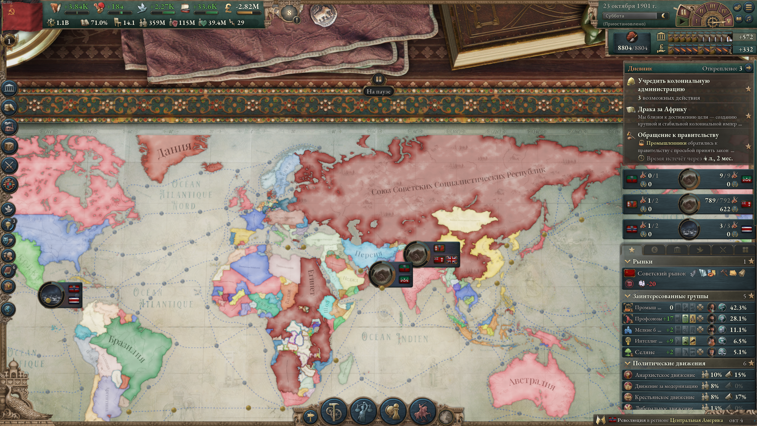Фух, бля. Закрыл свой маленький гештальт: завоевал Африку. Из 76 членов блока только один независимый — Австралия (только потому, что она стала крупной державой, прежде чем я смог ее подчинить).