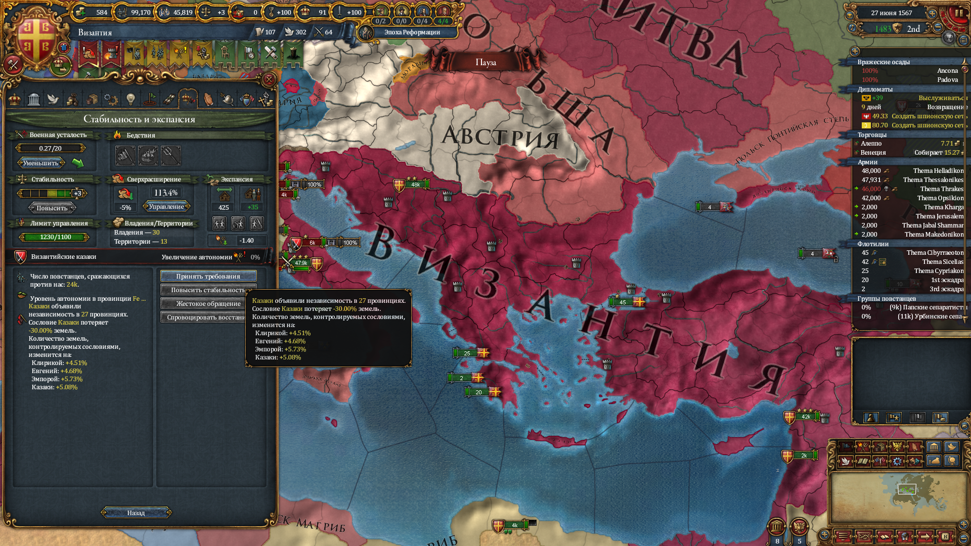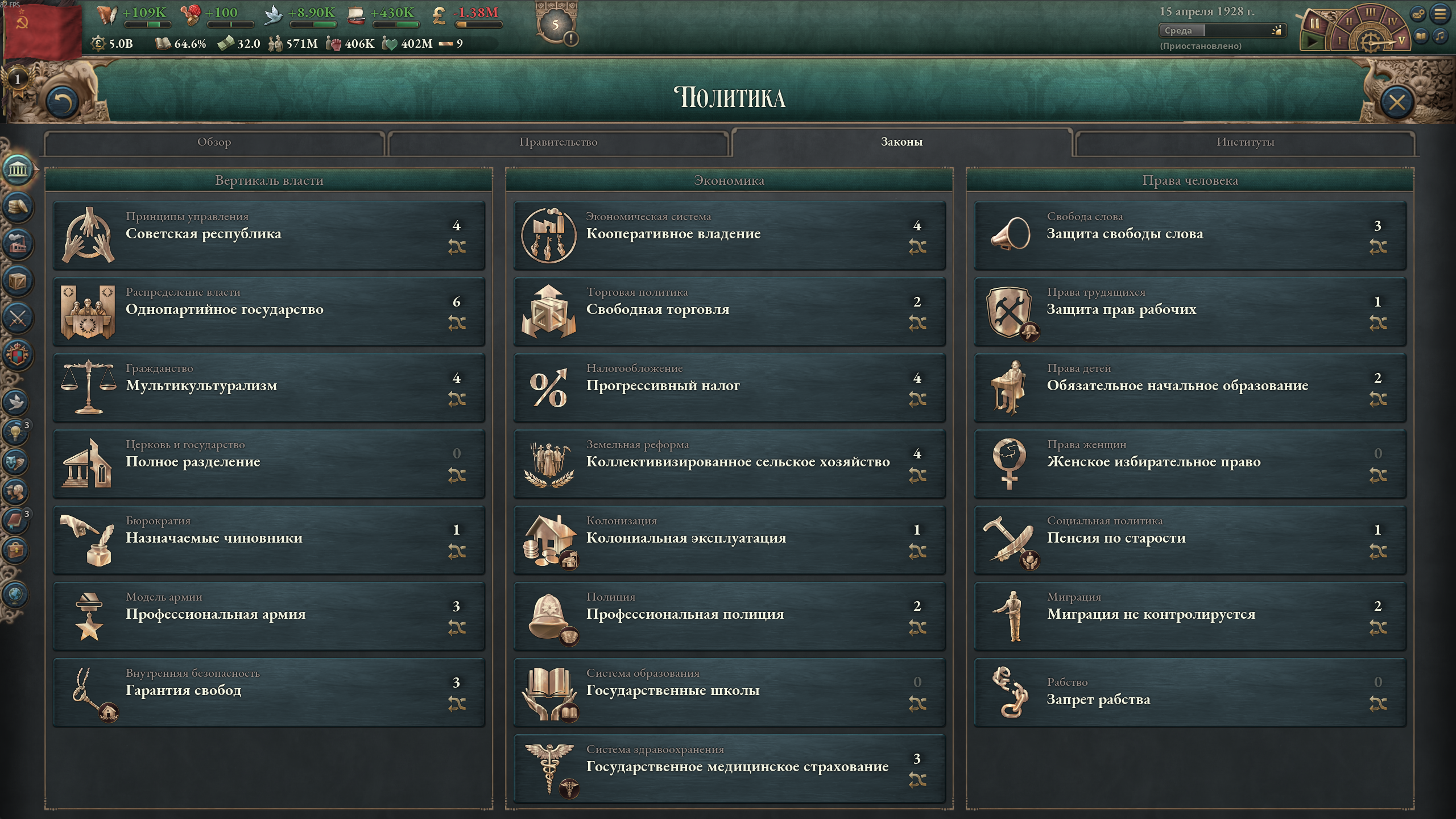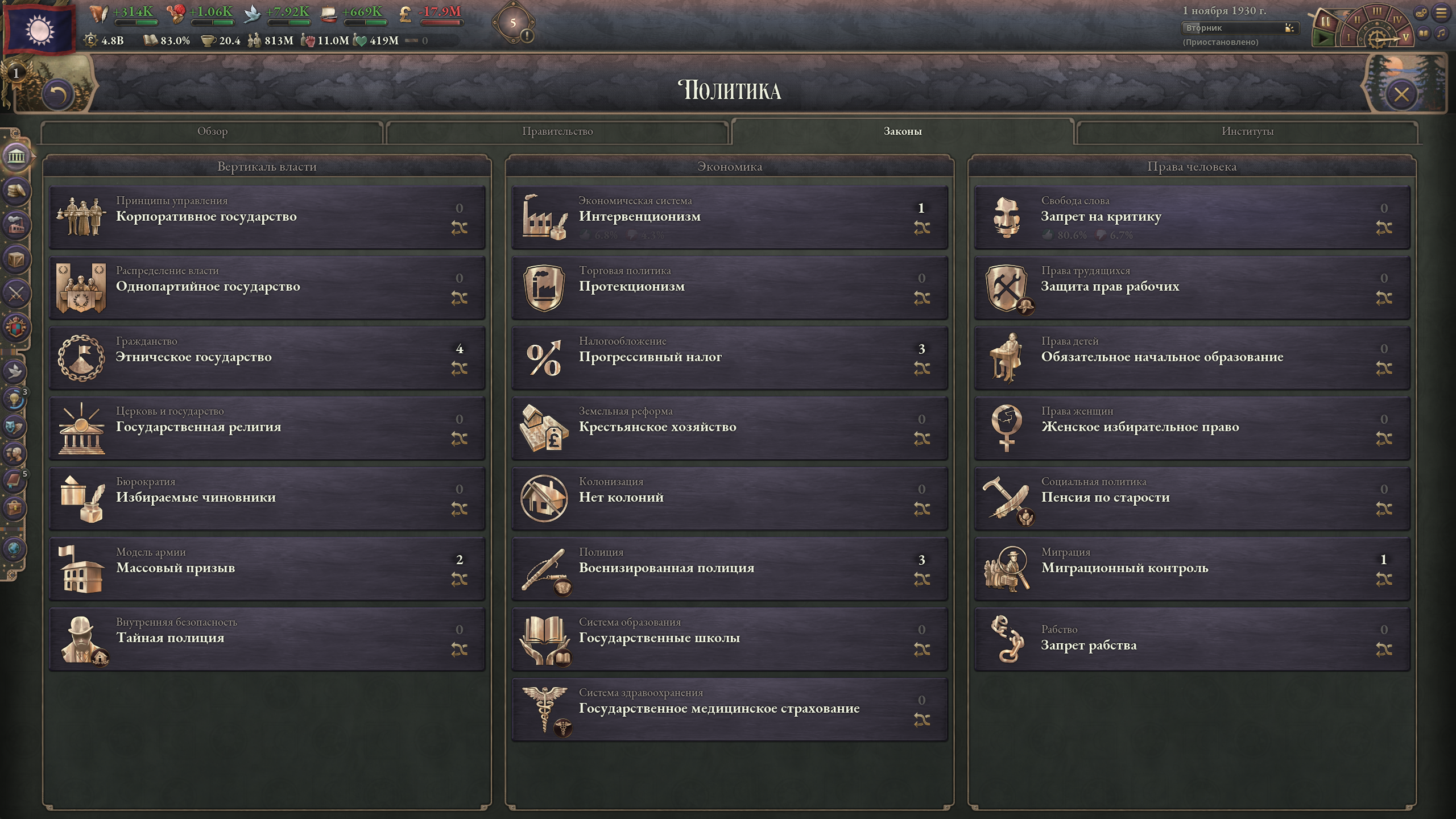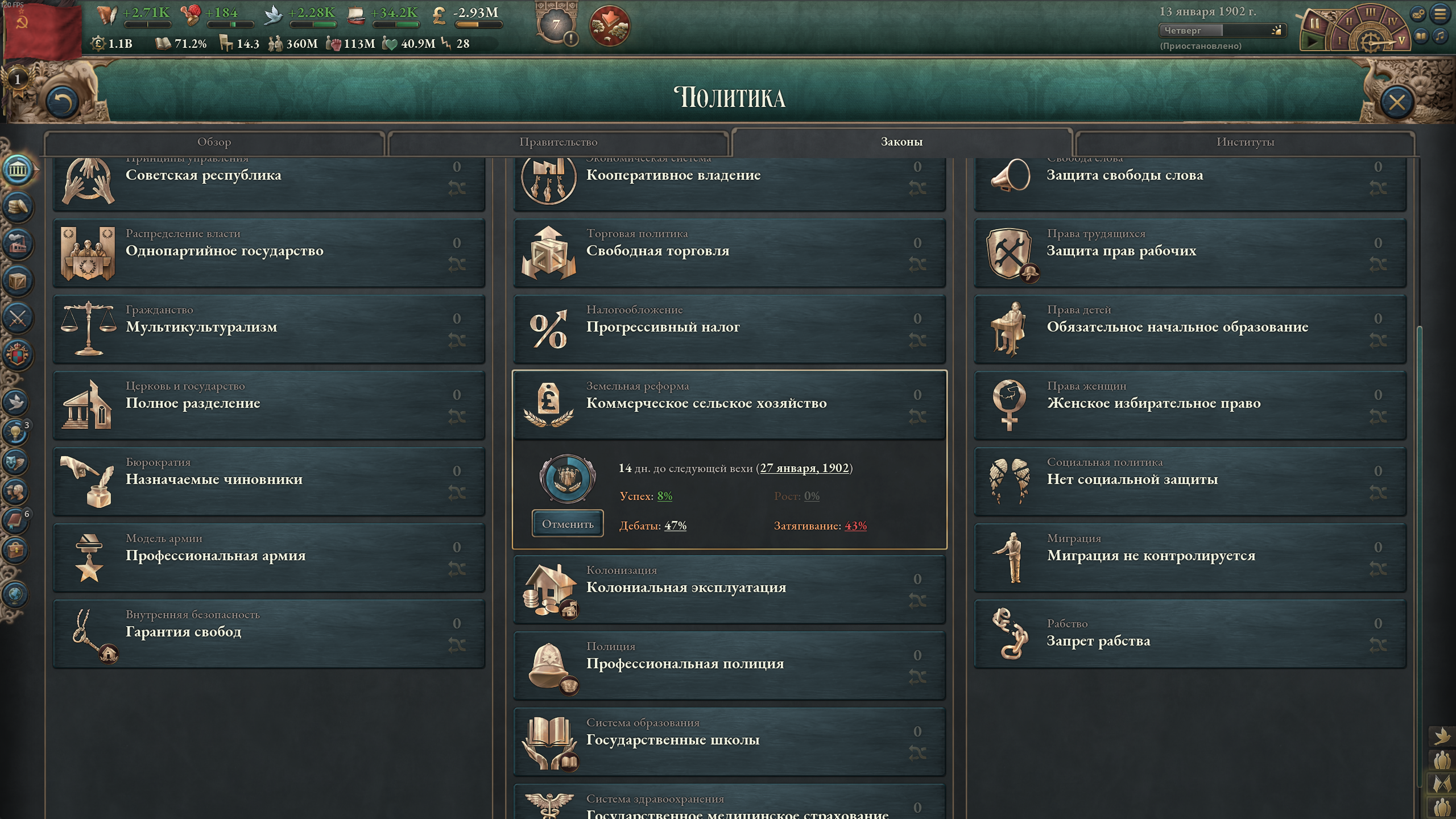 >>50169894 И нихрена не началось. Еще и с агитаторами не повезло. Один мужик, сделал его генералом и прокачал, остальные женщины. Право голоса для женщин тоже никто не хочет а еще тут походу баг, зашел в чит режиме и принял право голоса для женщин, появилась кнопка сделать женщину генералом, жму ее, а она не становится генералом. Пришлось принять частные школы, бонус влияния вывел интеллигентов из отчуждения. Буду сто лет принимать культурное отчуждение.