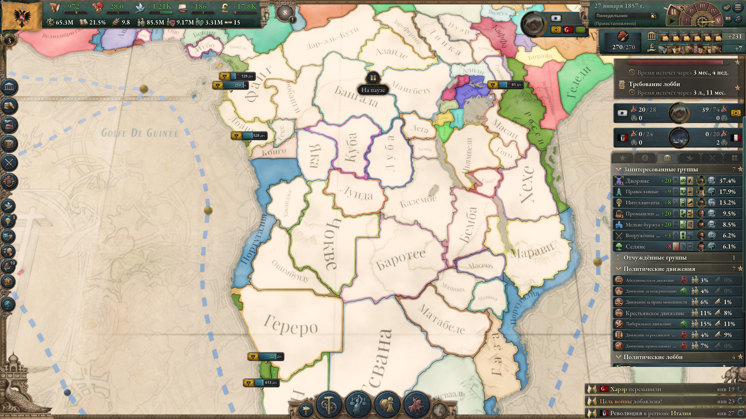 Пиздец за Бразилию скучно играть, я хуею. На захват ЮА провинций тратится очень много инфэйми, а надо ведь еще другие государства протекторатить, чтобы блок набирал силу. Сидишь, как еблан, без стройки, отменяешь рабство и большую часть времени сидишь афк. Да, потом, где-то в девяностые начинается веселье, но за все страны весело играть в девяностые+.