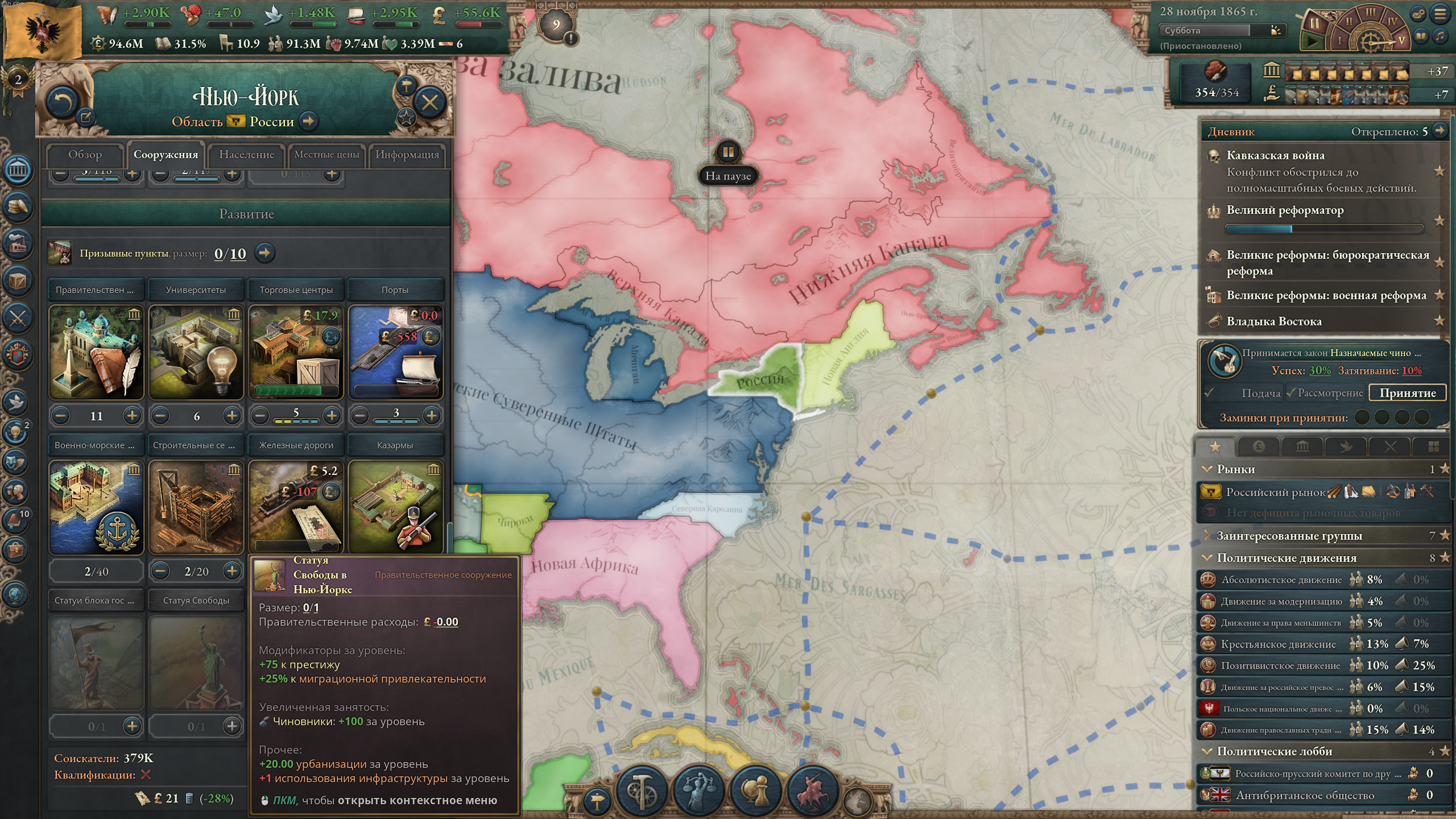 >>50170795 В этот раз поиграю без совка, а с протекционизмом и интервенционизмом. Всем рекомендую захватывать Нью-Йорк, Статуя Свободы дает ебнутый бонус на миграцию. Я еще думал насчет захвата Мичигана ради Форд Моторс, но это слишком геморно оказалось.
