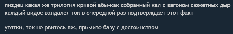 >"Обратный отсчет" - за исключением двух поехавших, все остальные - адекватные люди, которые заняты кто заданиями, кто собирательством. Скоро половина книги так превратится в "двух поехавших". Мой доёб был не к поехавшести, а к тому, что это скуфобоевик уровня Андрея Круза. С сопутствующими ЗОВАМИ, ИНФЕРНАЛЬНЫМИ ФАЛЛОСАМИ, философией МУЖИКОФФФФ и бромансами. Как говорил кто-то, что некоторые пейсаки просто брали свои черновики для фэнтези впопуданцев, меняли место действия на Зону и хуярили в печать. Хули ты так рвёшься с этого - неясно. Шалыгин это скуфобоевики про скуфов и смазочку, как бы ты не лопался.