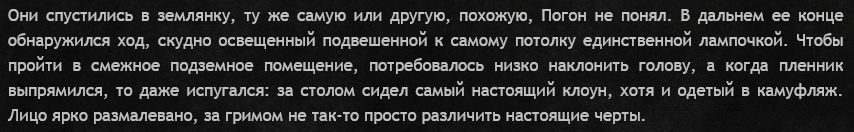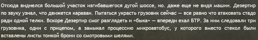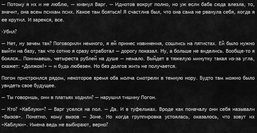 «А если разобраться, что такое для сталкера пять часов? Плюнуть и растереть. А двенадцать часов не хочешь? А двое суток не хочешь? Когда за ночь не успел, целый день в Зоне лежишь рылом в землю и уже не молишься даже, а вроде бы бредишь, и сам не знаешь, живой ты или мертвый…»