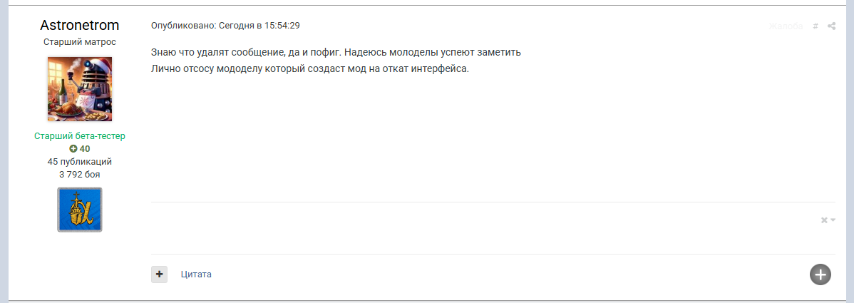>>50182424 Как же я угарнул, как на замену этому джедаю в моменте резко выскочили два других подсоса на деф. Ведь джедай последние два дня слегонца занят в других не менее важных темах, задавая некоторые крамольные вопросы: >Планируется ли мод на отключение новых циферок урона? >К сожалению, сочетание шрифтов, цветов и новых иконок делает вид корабля в порту не просто хуже, чем было раньше, а как-то прям совсем плохо. Какой-то большой шаг назад. >Надеюсь, я просто чего-то не понимаю, и на самом деле такие изменения пойдут на пользу игре Кажись он сломался, агент от лесты на устранение уже выехал.