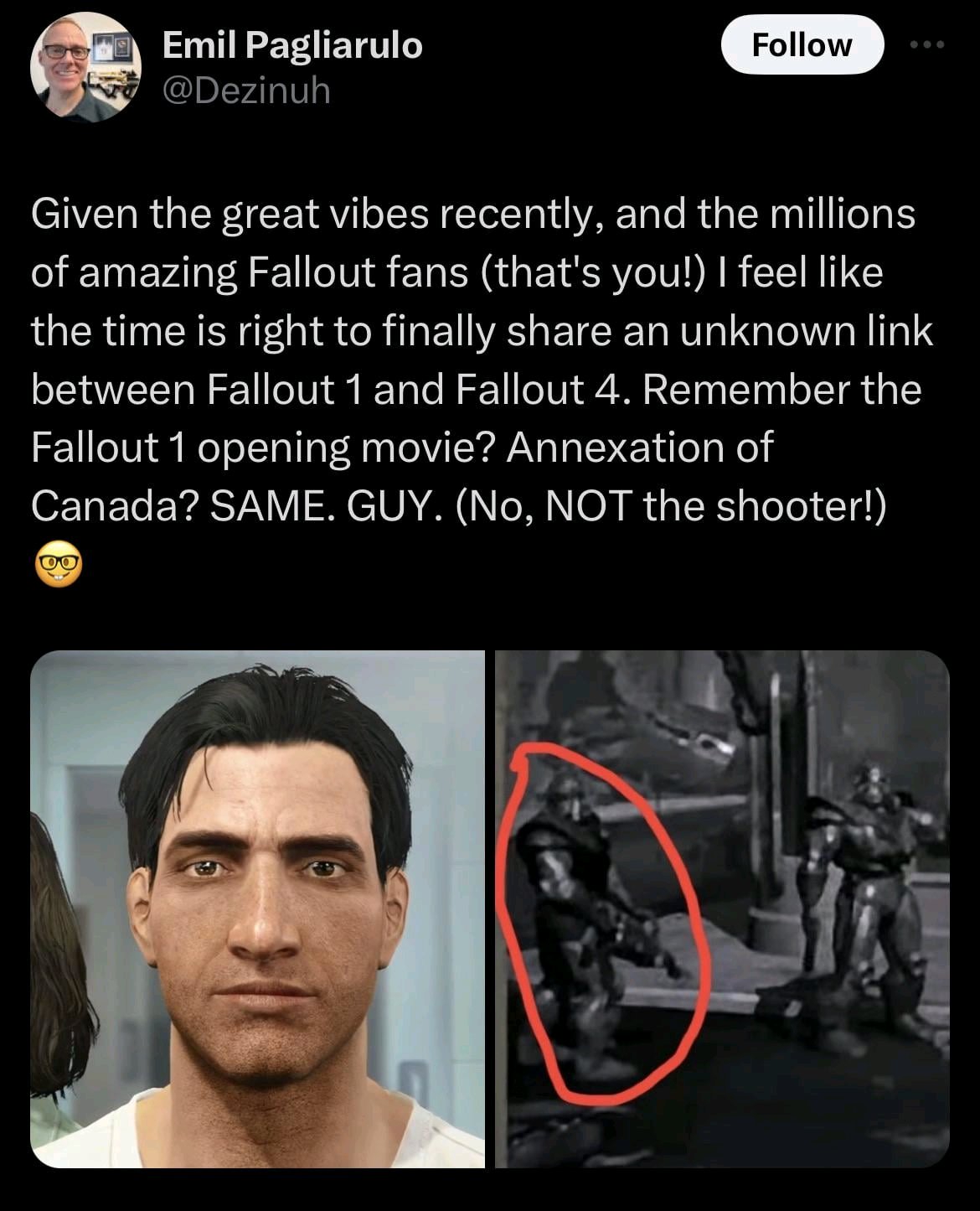 🟠Есть шанс на ремастер Fallout 3, о котором говорят уже пару лет; 🟠Также есть теория, что Миддлер наменул на Fallout: New Vegas. И в этом даже будет принимает участие Obsidian; 🟠Маловероятно, но некоторые подумали на Fallout 5. Это почти нереально из-за активной разработки TES 6.