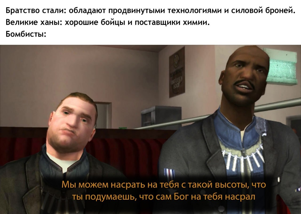 >>50161640 >как паладины в ДнД против всего плохого и за всё хорошее Ты наркоман? В каком месте месте отстрел гулей и мутантов не разбираясь, мирные они там или агрессивные, т.е на почве расизма, грабёжь, вымогательство и пытки, стали чем-то хорошим? И они точно так же шлют нахуй всех кто даже просто поторговать с ними хочет. Нужно быть им чем-то реально полезным, что бы иметь с ними какие-то дела. В том же длц на анкоридж они шлют тебя нахуй, даже несмотря на то что ты их провёл через супермутантов. Потом видят твой пип-бой и всерьёз размышляют не отобрать ли его в благодарность за твою помощь. А когда ты им дверь открываешь, с которой они сами не могли справиться, они тебя убить пытаются, за то что ты претендуешь на какую-то долю ништяков. У тода они с самого начала были мудаками, начинающие скользкую дорожку к превращению в анклав.