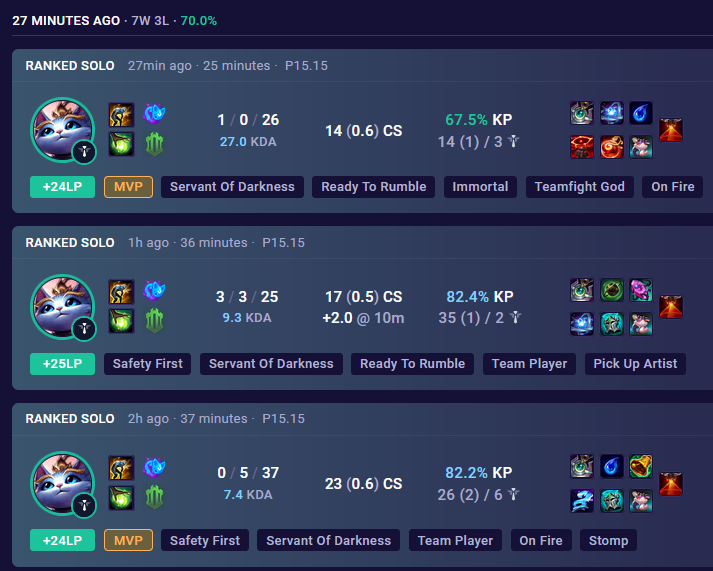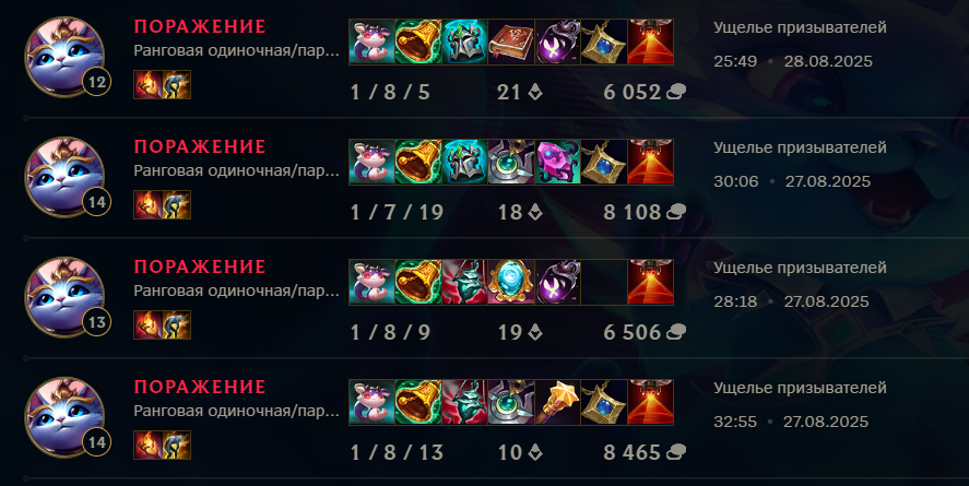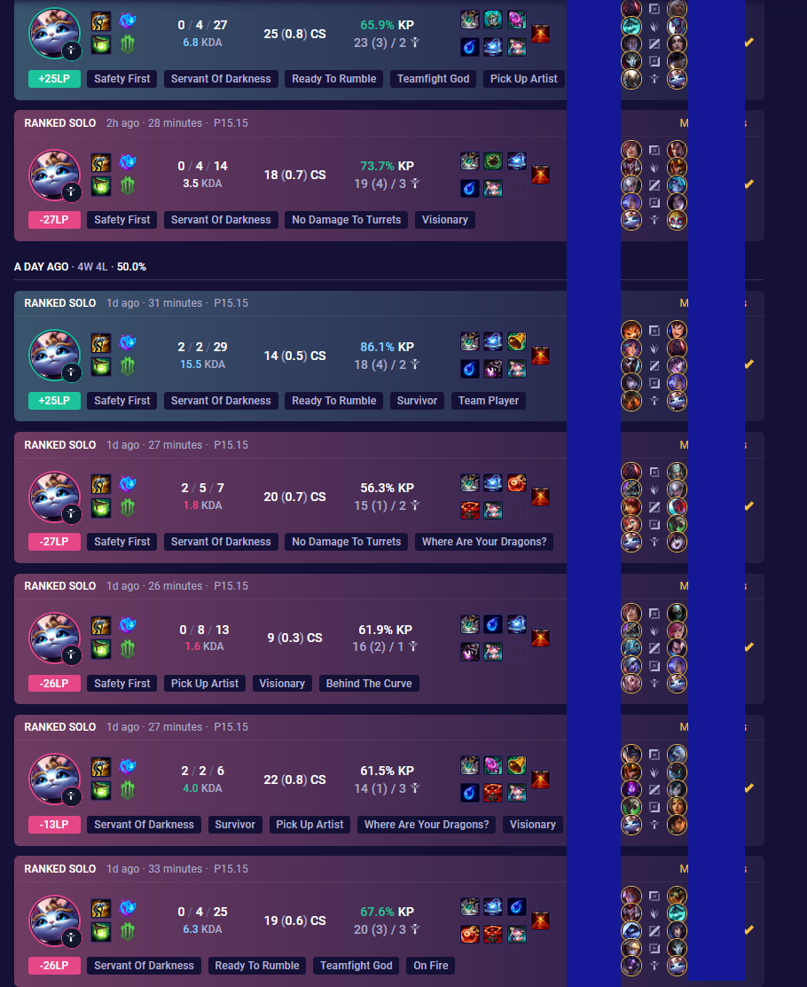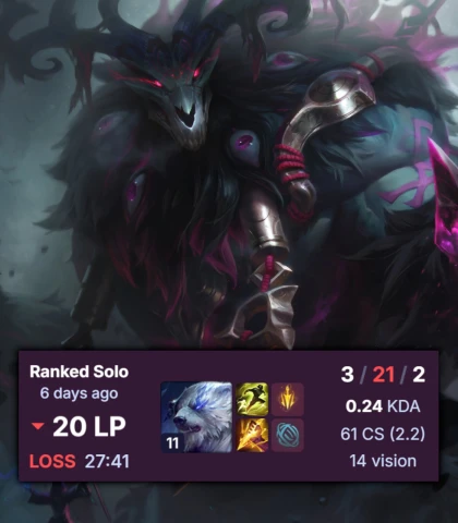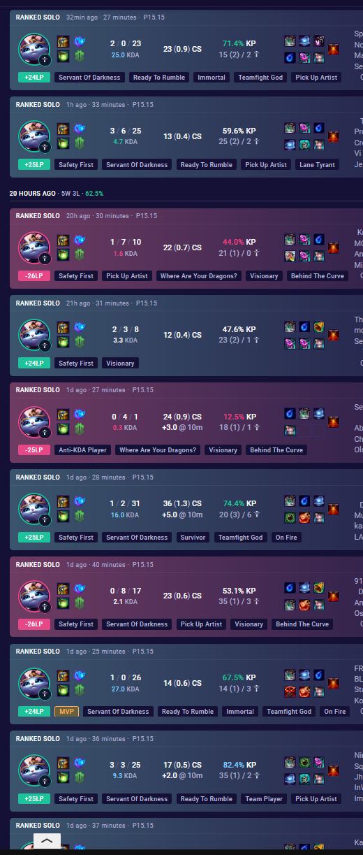 Вот и весь ранкед в этой мобе, система просто катает игроков на дофаминовых качелях, то давая победить, то наваливая лузов, а игроки и рады, думая, что они что-то решают и борются в огромном чане говна за очередную рамочку и скин, играя по 1000 ранкедов за сезон