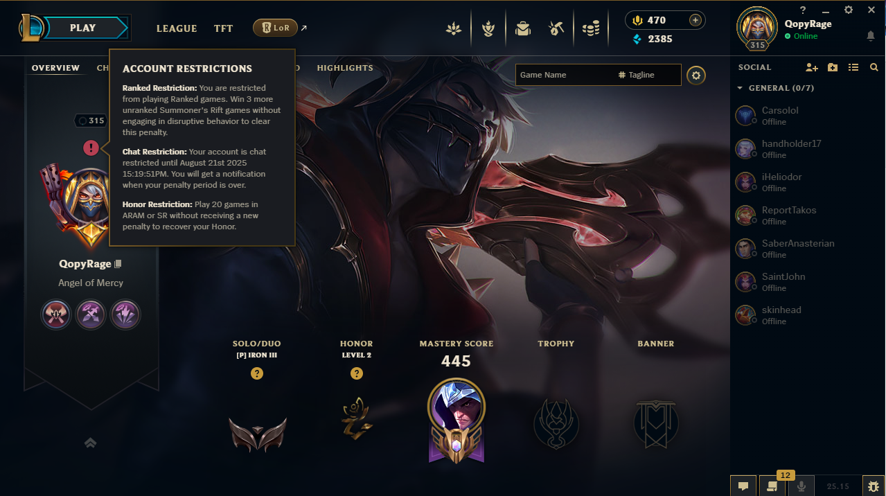 >>50094546 Именно так, банили на неделю. Честь с 3 до 2 уровня скинули. Сейчас вот такая хуйня, но счетчик не убавляется когда играешь. Я хз прост интересно уже открутится обратно или нет.