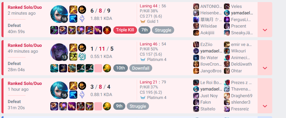 тот факт что я не в голде 3 возмутителен. вот тут часто пишут про хуевую команду (и я бывает) но лучше уж хуевая команда чем когда ты как говно по течению плывешь и оно тебя выносит на платину 3. я не хочу так побеждать...