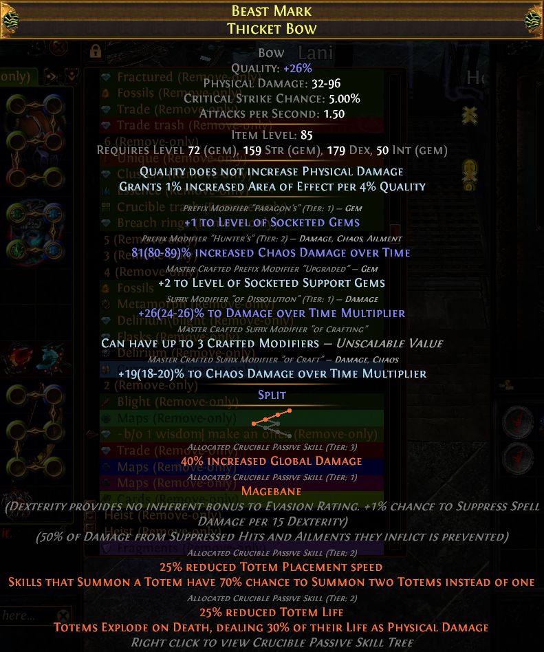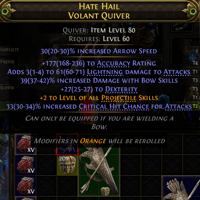 Ебать я дурачок. Решил покрафтить, не посмотрев веса. У т1-т2 инкриз физы на луке шанс 1%, а я его одним из последних аффиксов нароллить хотел, когда каждая крутка по 3 дивайна стоит.