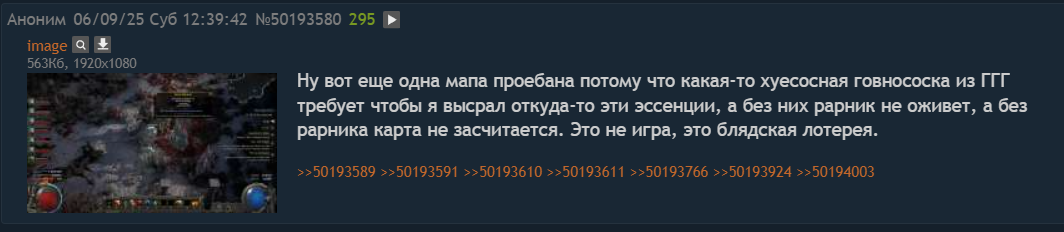 Аноны я короче всё, наигрался, игра говно. Дошел до т15 смысла игры не вижу, падает мусор, валюты нет, шмотки стоят на трейде десятки дивайнов, мне 1 упал за всю игру пока шел к т15, смысла играть нет. Ни на что не накопить. Все слишком дорогое. Видимо разрабы думали что игрок типа будет там чето крафтить по кд как стримеры, но обычному игроку это нахуй не упало, в итоге имеем что обычные игроки теряют интерес к игре ведь шмот не купить, а фармить карты на которых даже 1 дивайн за 20 карт не накопить нахуй надо. Сидеть собирать мусор с пола стоимостью обрывок свитка не интересно. Контент не интересен. Каждая карта одинаковое говно