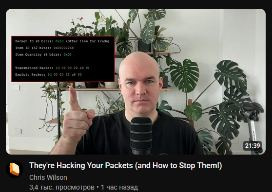 Видео [They're Hacking Your Packets (and How to Stop Them!)](https://www.youtube.com/watch?v=x4RNkj_0Mso) от Криса Уилсона — это глубокий разбор уязвимостей сетевых протоколов в онлайн-играх и способов их устранения. Вот ключевые моменты: