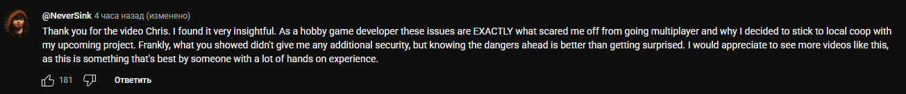 ### 💬 Реакция аудитории: - Видео получило множество положительных отзывов от разработчиков и этичных хакеров. - Многие комментаторы отмечают, что материал помог им лучше понять риски и укрепить свои проекты. - Некоторые признались, что именно страх перед подобными уязвимостями удержал их от создания мультиплеерных игр.