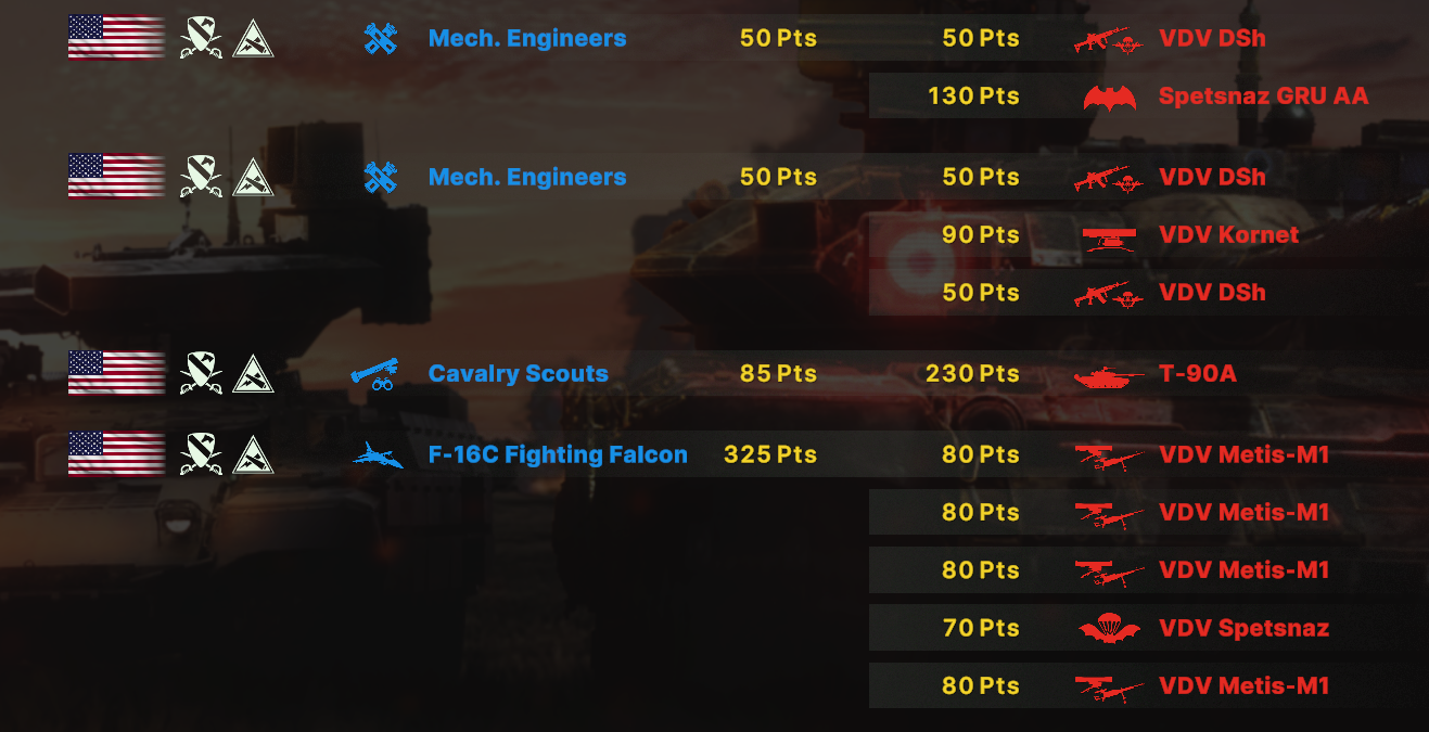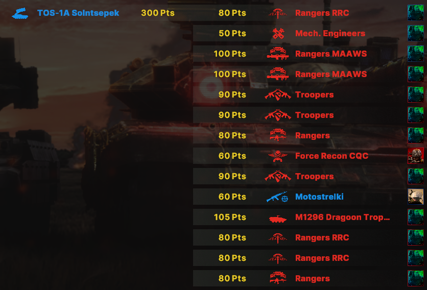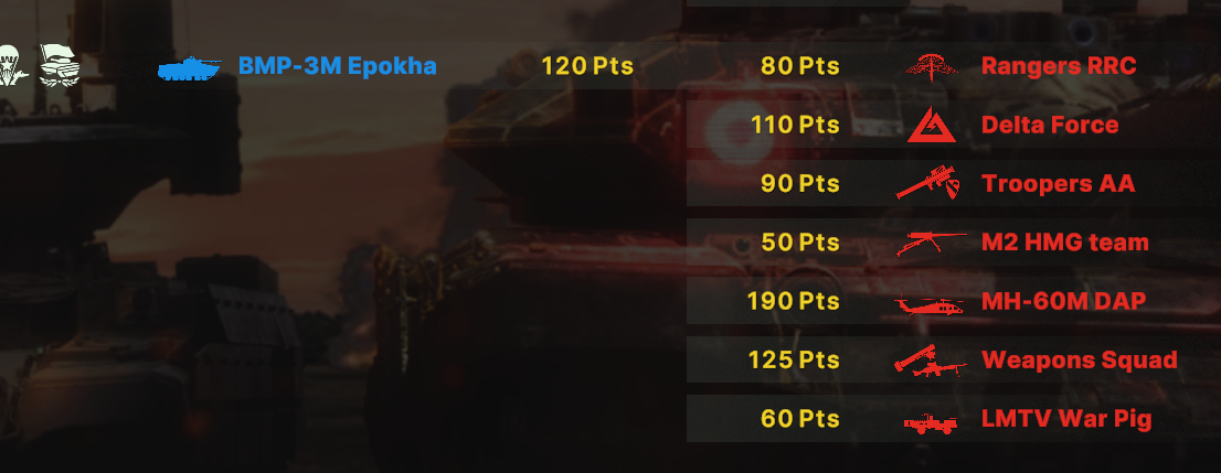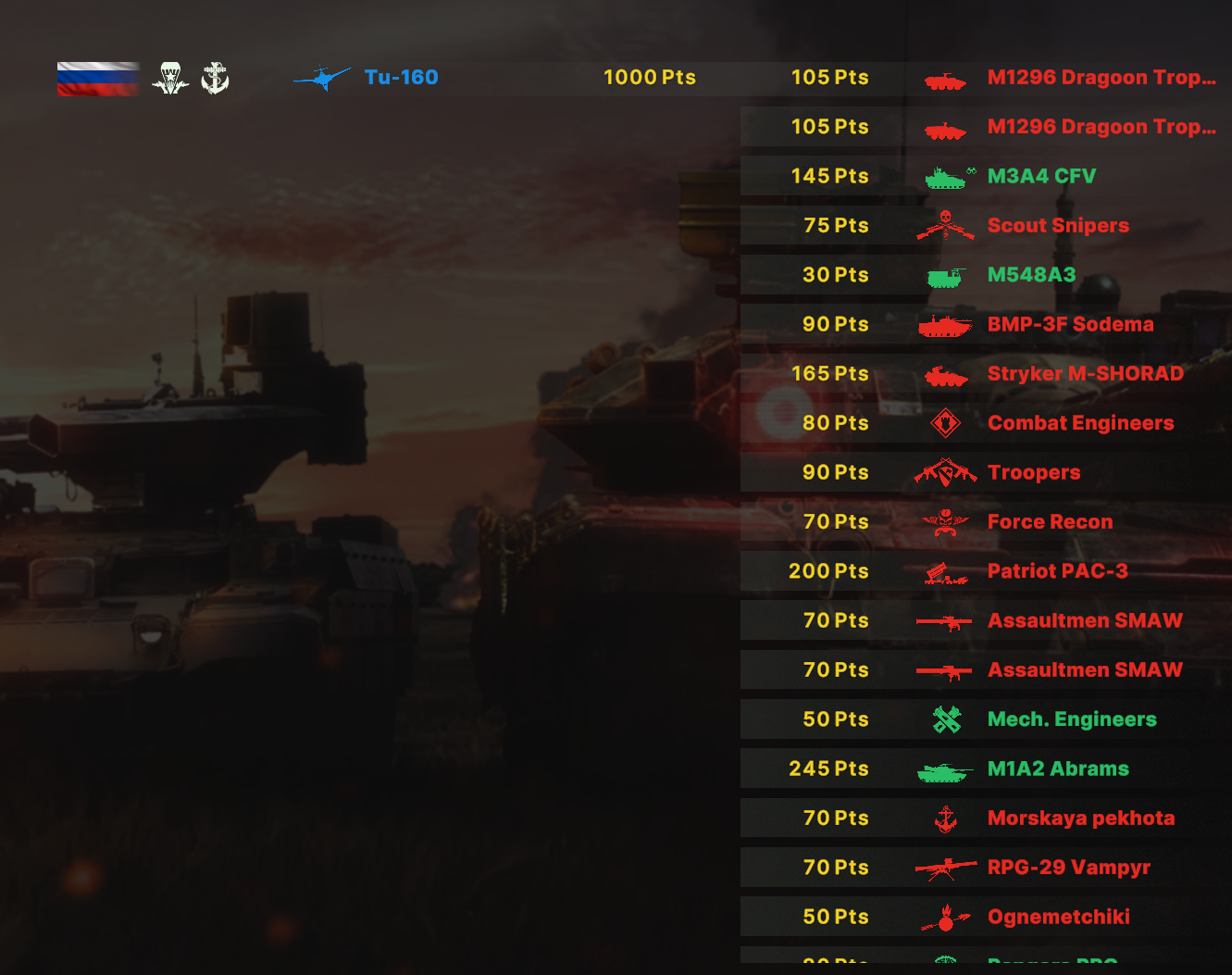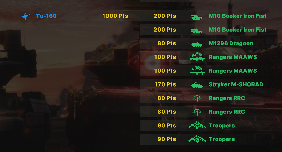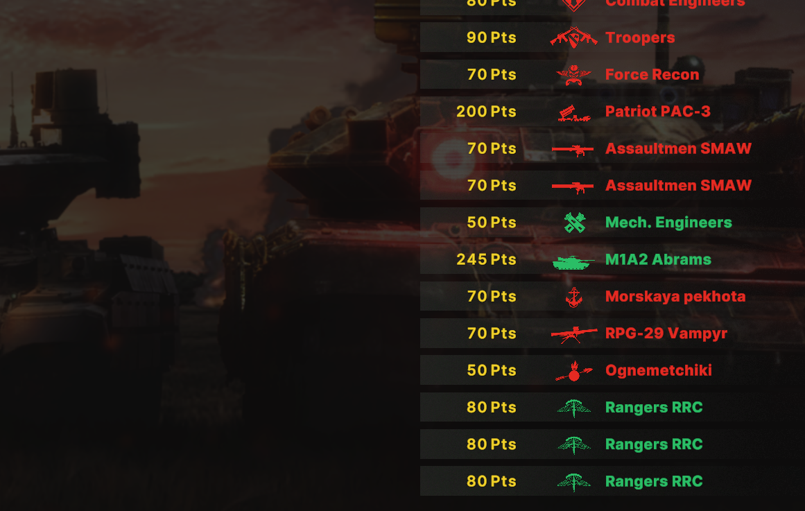 Там очков не хватит взять всех юнитов. Для спама на захват точки лучше подойдут инжырнеры +ассаулты. Для закрепа самый топ будет КААТ тоу, потому что их ебаный пулимет делит на ноль любую пехоту.